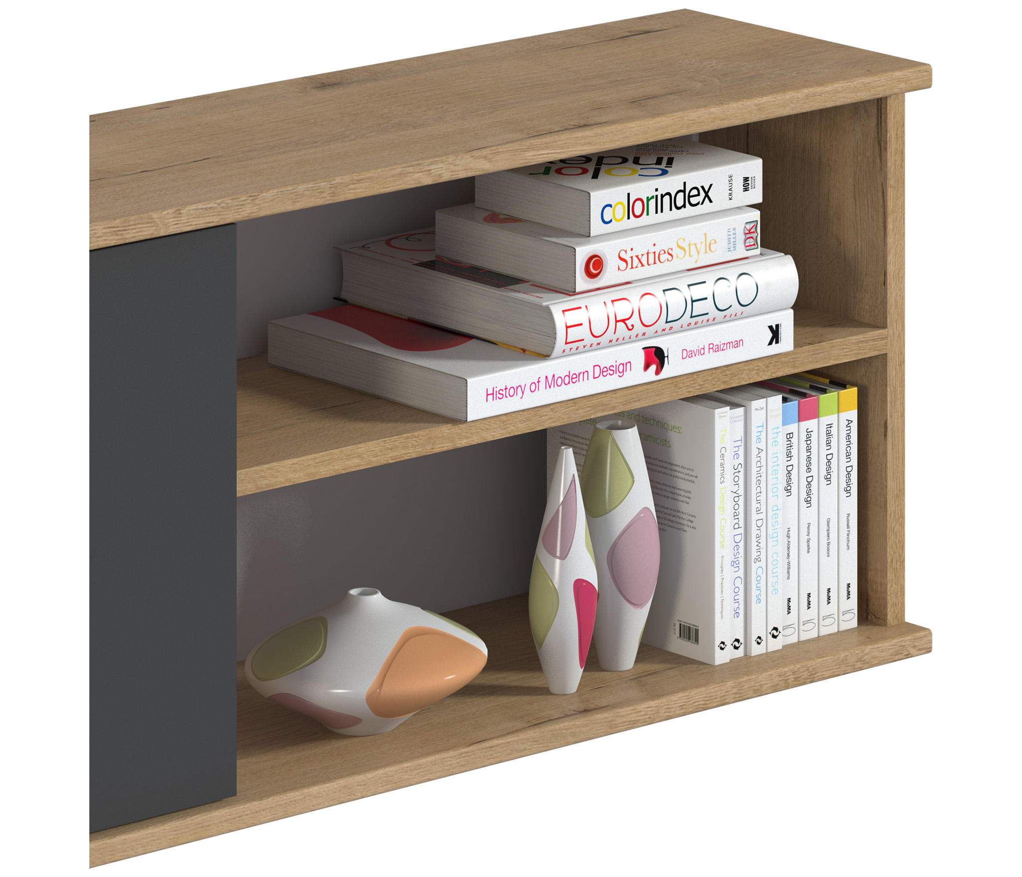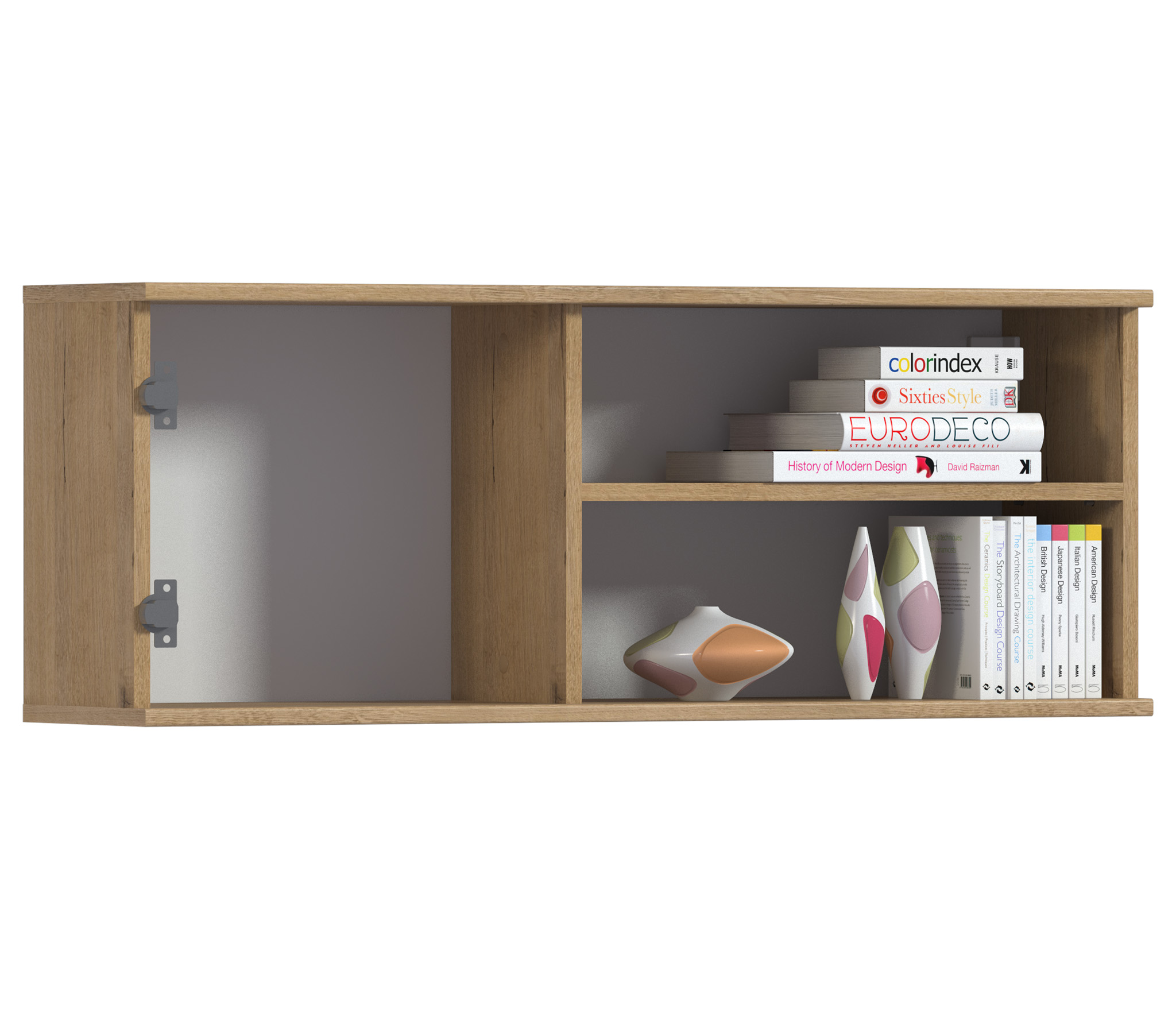 Габаритные размеры – ширина 103 см, высота 39 см и глубина 24 см. Полка состоит из двух открытых отделений, расположенных одно над другим и одного отделения за глухой дверцей.Выполнена полка из современного материала. .Полка крепится к стене при помощи дюбелей, которые входят в комплект.