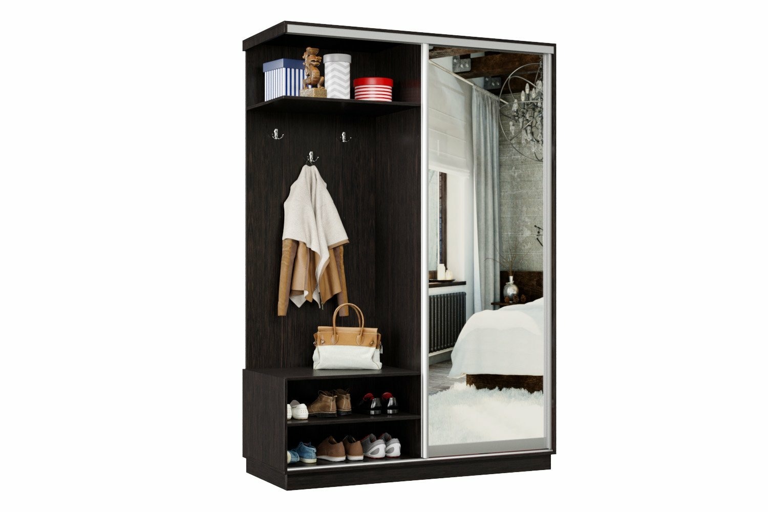 Дверь делит шкаф на 2 равные части: отделение для верхней одежды и отделение с полками и крючками.