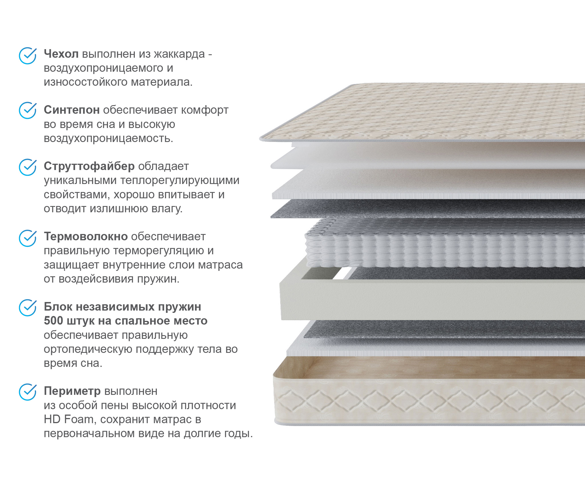 Матрас: СтруттоФайбер Лен Н20мм, блок независимый Poket spring Н140 мм, 256 пружин на 1м2, 256 пружин на 1м2, система усиления периметра матраса