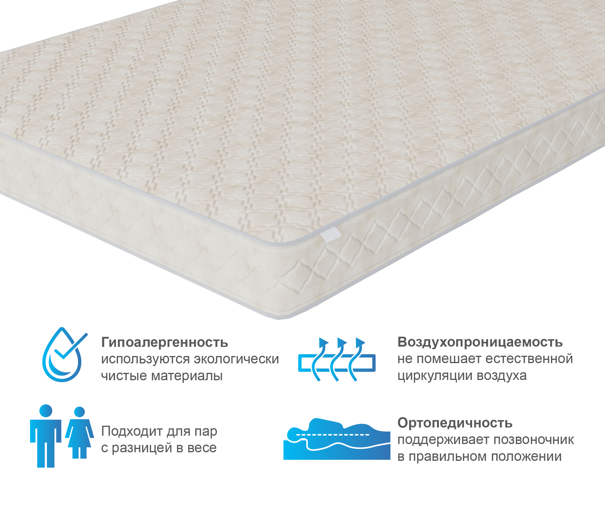 Чехол из хлопкового жаккарда обеспечит надежную защиту матрасу и сохранит превосходный внешний вид на долгие годы. Материал экологически чистый, не вызывает аллергии и тем самым отлично подходит для людей склонных к аллергии. Модель рассчитана на нагрузку в 100 кг на одно спальное место.