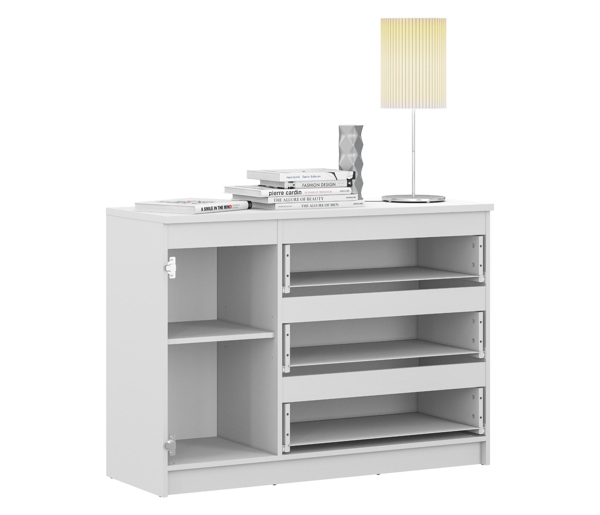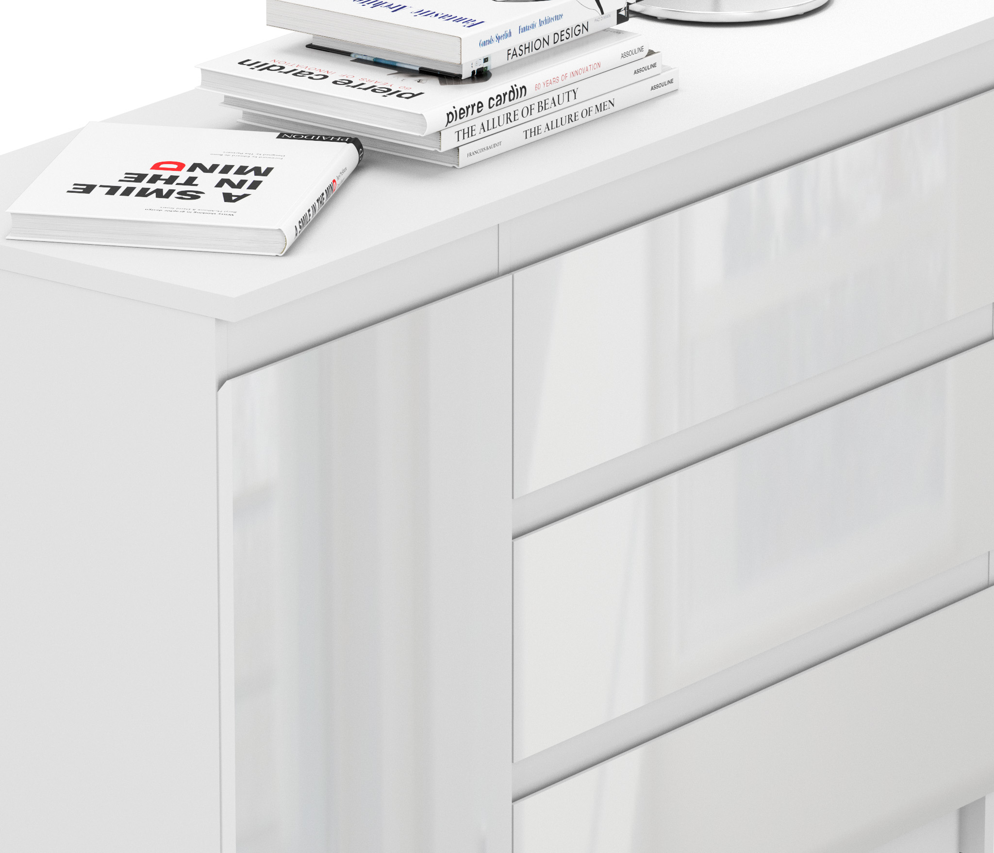 Размеры комода – ширина 120 см, высота 86 см и глубина 44 см. Под одной столешницей объединены три выдвижных ящиков и тумба. Тумба оснащена двумя довольно высокими полками. Комод Медея выполнен из прочного и влагоустойчивого материала. Все выдвижные механизмы прочные и имеют солидный ресурс. Комод выполнен в лаконичном дизайне, белое глянцевое покрытие фасадов позволяет смотреться этому предмету мебели стильно и не громоздко.