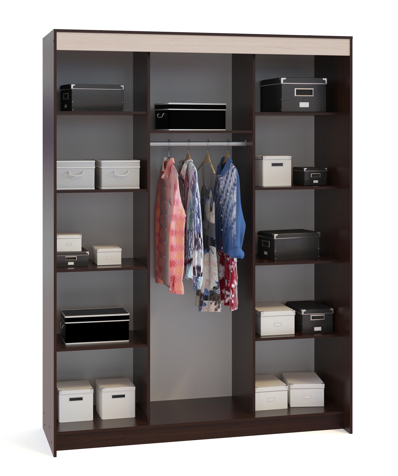 Для размещения вещей предусмотрены центральное отделение со штангой для вешалок и боковые отсеки с четырьмя полками в каждом. Большое внутреннее пространство позволяет хранит в шкафу коробки с обувью и габаритные предметы.