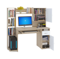 Удобный компьютерный стол с большим количеством полок. Такое решение прекрасно подойдет для организации места для учебы. В боковом стеллаже на нижней полке можно удобно разместить системный блок. За распашными дверками также находятся полки. Стол оборудован выдвижным ящиком и полкой для клавиатуры, которую можно не устанавливать, если вы планируете работать за ноутбуком.