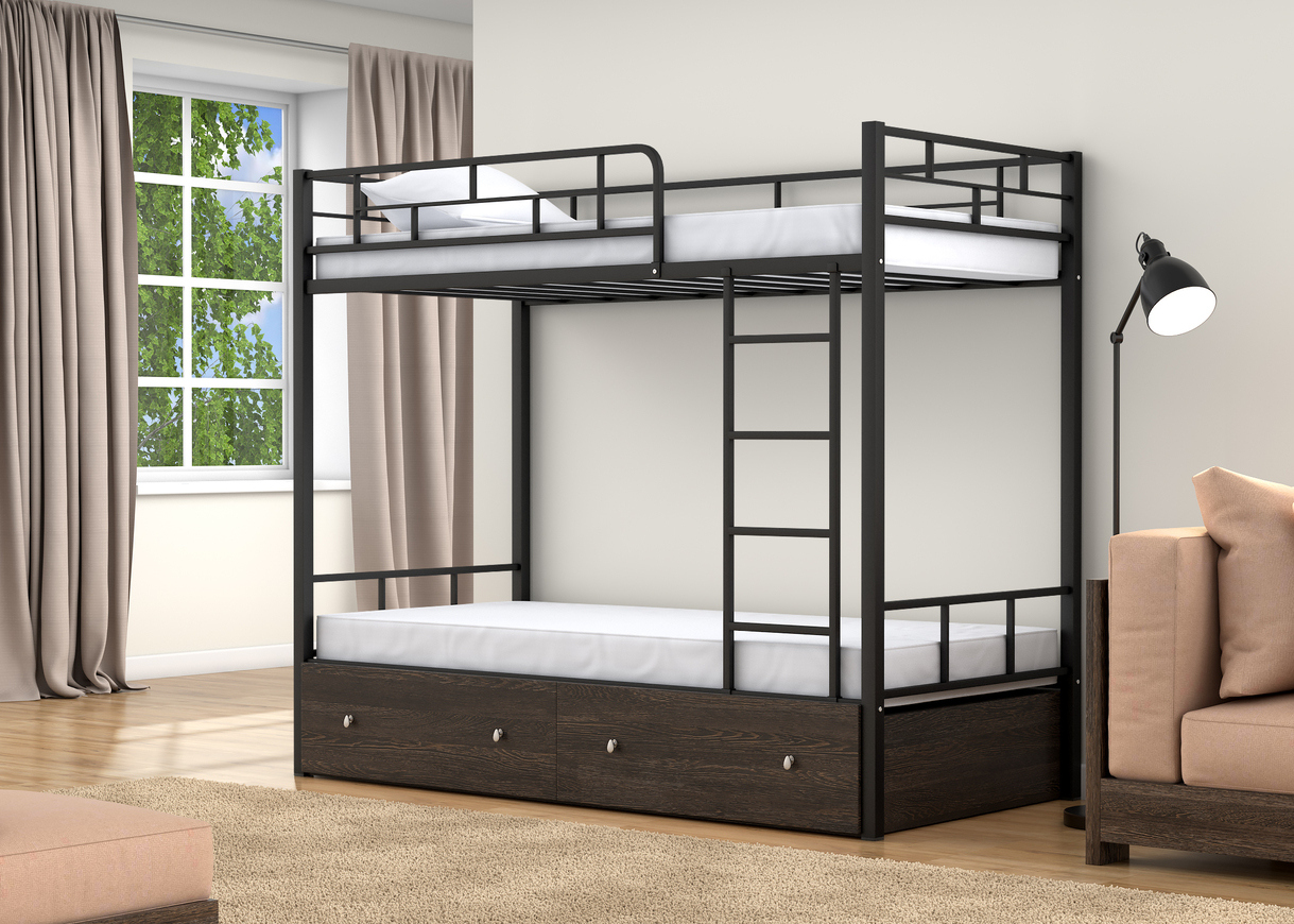 Спальные места 90х190 см., прочный стальной каркас, покрашен безопасной не имеющей запаха порошковой краской. Цвета на выбор: коричневый, черный, слоновая кость. Дополнительно комплектуется выдвижными ящиками и навесной полкой, материал ЛДСП 16 мм., цвета на выбор: дуб молочный или венге.