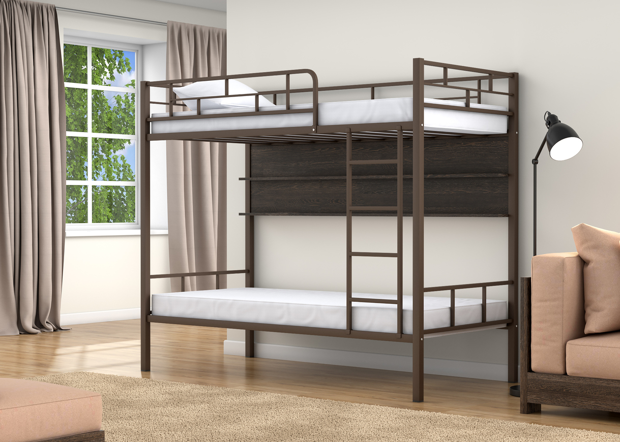 Спальные места 90х190 см., прочный стальной каркас, покрашен безопасной не имеющей запаха порошковой краской. Цвета на выбор: коричневый, черный, слоновая кость. Дополнительно комплектуется выдвижными ящиками и навесной полкой, материал ЛДСП 16 мм., цвета на выбор: дуб молочный или венге.