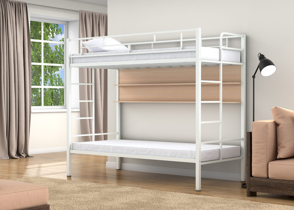 Спальные места 90х190 см., прочный стальной каркас, покрашен безопасной не имеющей запаха порошковой краской. Цвета на выбор: коричневый, черный, слоновая кость. Дополнительно комплектуется выдвижными ящиками и навесной полкой, материал ЛДСП 16 мм., цвета на выбор: дуб молочный или венге.