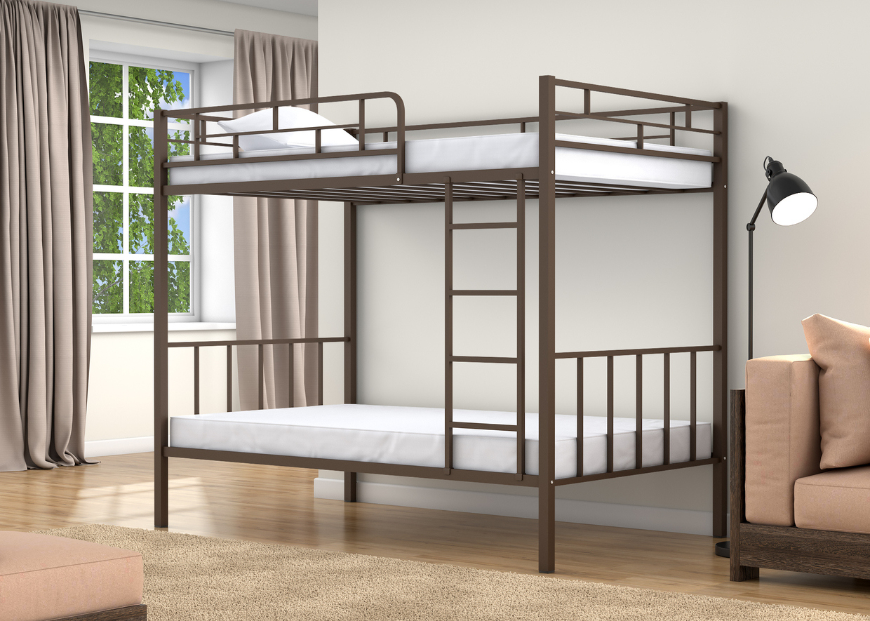 Спальные места 120х190 см., прочный стальной каркас, покрашен безопасной не имеющей запаха порошковой краской. Цвета на выбор: коричневый, черный, слоновая кость. Дополнительно комплектуется выдвижными ящиками и навесной полкой, материал ЛДСП 16 мм., цвета на выбор: дуб молочный или венге.