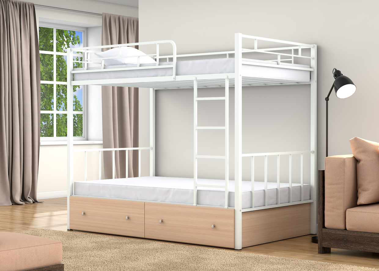 Спальные места 120х190 см., прочный стальной каркас, покрашен безопасной не имеющей запаха порошковой краской. Цвета на выбор: коричневый, черный, слоновая кость. Дополнительно комплектуется выдвижными ящиками и навесной полкой, материал ЛДСП 16 мм., цвета на выбор: дуб молочный или венге.