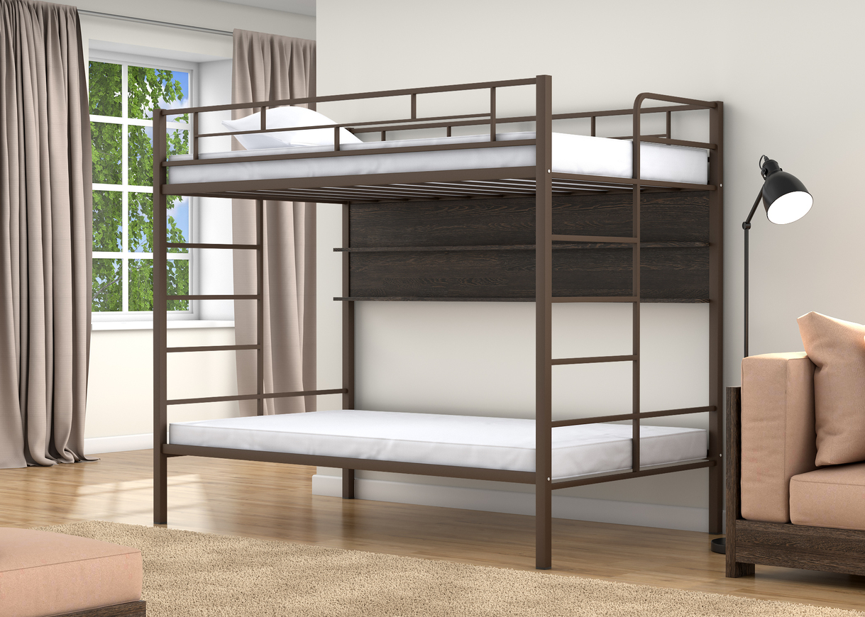 Спальные места 120х190 см., прочный стальной каркас, покрашен безопасной не имеющей запаха порошковой краской. Цвета на выбор: коричневый, черный, слоновая кость. Дополнительно комплектуется выдвижными ящиками и навесной полкой, материал ЛДСП 16 мм., цвета на выбор: дуб молочный или венге.