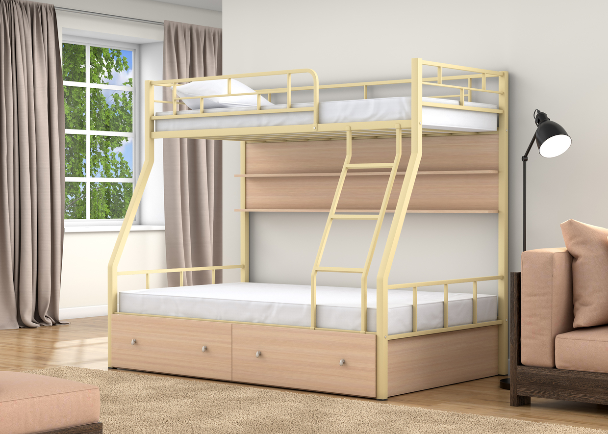 Двухъярусная кровать Раута , спальные места 90х190 см. и 120х190 см., прочный стальной каркас, покрашен безопасной не имеющей запаха порошковой краской. Цвета на выбор: коричневый, черный, слоновая кость. Дополнительно комплектуется выдвижными ящиками и навесной полкой, материал ЛДСП 16 мм., цвета на выбор: дуб молочный или венге.