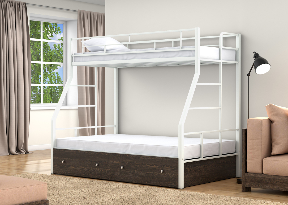 Двухъярусная кровать Раута Твист, спальные места 90х190 см. и 120х190 см., прочный стальной каркас, покрашен безопасной не имеющей запаха порошковой краской. Цвета на выбор: коричневый, черный, слоновая кость. Дополнительно комплектуется выдвижными ящиками и навесной полкой, материал ЛДСП 16 мм., цвета на выбор: дуб молочный или венге.