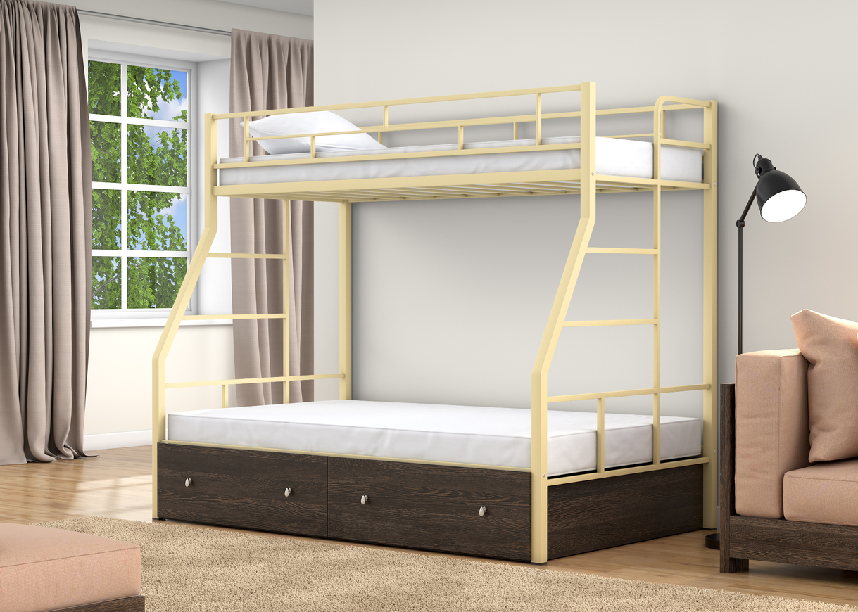 Двухъярусная кровать Раута Твист, спальные места 90х190 см. и 120х190 см., прочный стальной каркас, покрашен безопасной не имеющей запаха порошковой краской. Цвета на выбор: коричневый, черный, слоновая кость. Дополнительно комплектуется выдвижными ящиками и навесной полкой, материал ЛДСП 16 мм., цвета на выбор: дуб молочный или венге.