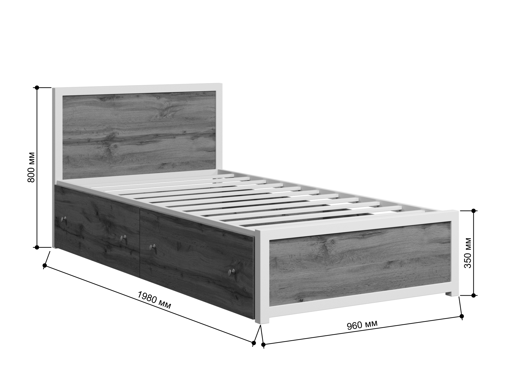Кровать серии Титан Лофт. Каркас выполнени из прочного металла, покрашен порошковой краской, ящики и вставки сделаны из ЛДСП. Размер спального места 90х190 см. Максимальная нагрузка 150 кг.