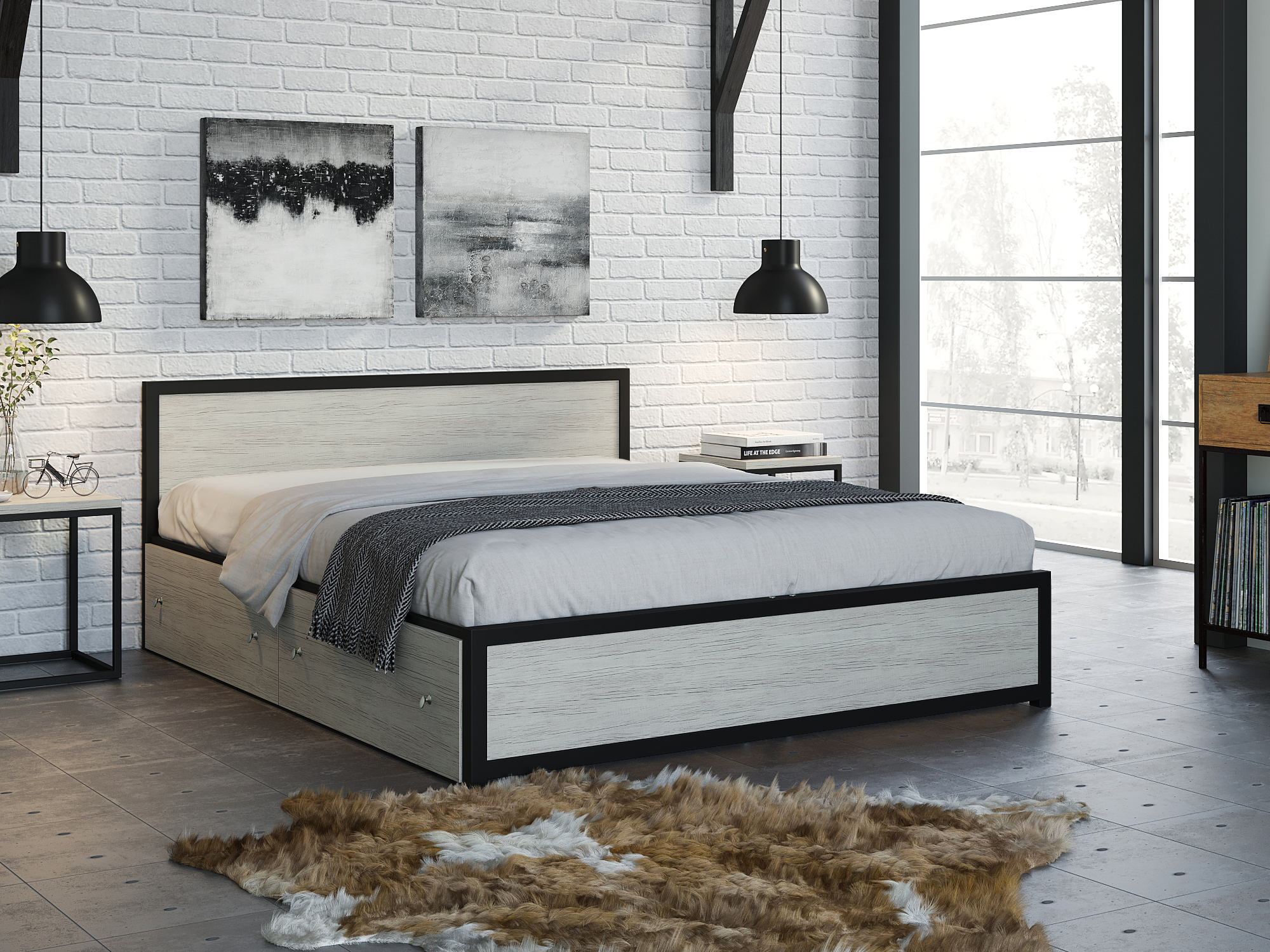 Кровать серии Титан Лофт. Каркас выполнени из прочного металла, покрашен порошковой краской, ящики и вставки сделаны из ЛДСП. Размер спального места 160х200 см. Максимальная нагрузка 400 кг.