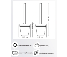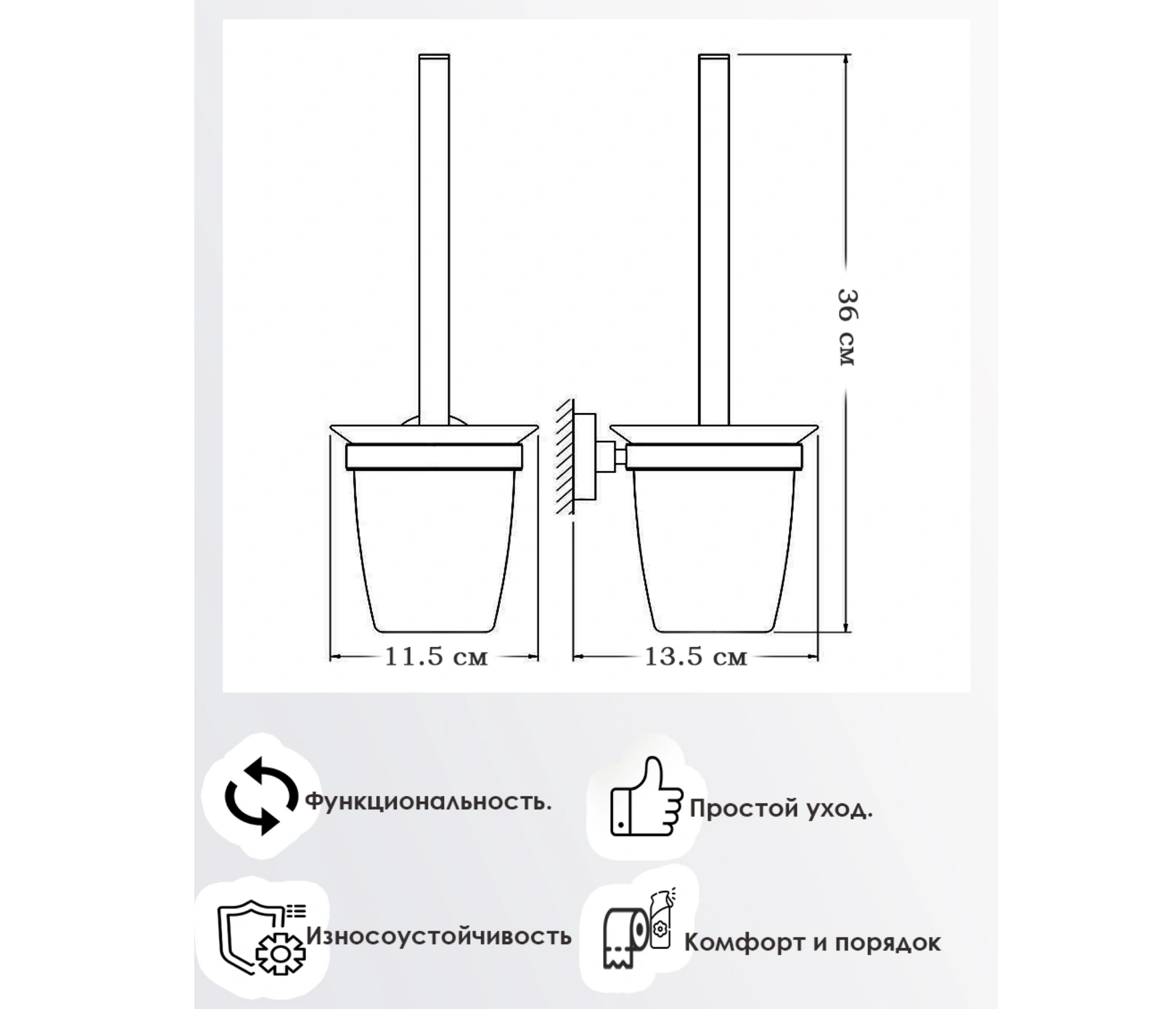 Ершик для унитаза незаменимый помощник для поддержания чистоты туалета. Аксессуар выполнен в классическом стиле, отлично подойдет для туалетной комнаты и дополнит Ваш интерьер. Гигиеничность, экономия места и удобство использования. Изделие монтируется к стене при помощи надежного крепежа.
