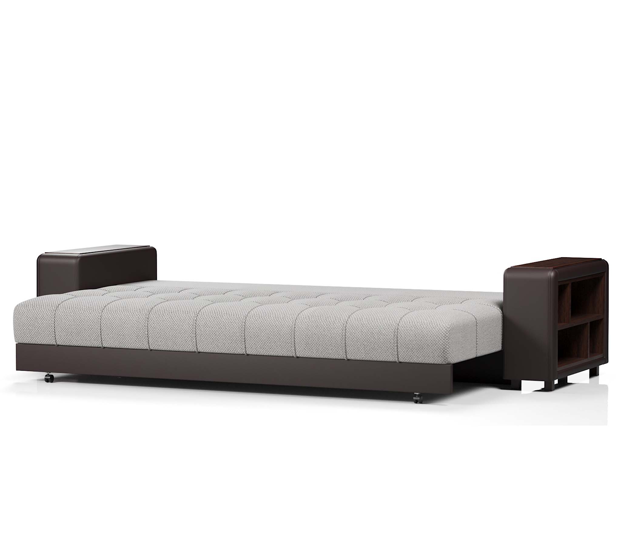 Прямой диван Дубай это отличный выбор для тех, кто планирует создать уют в своей квартире. Модель имеет выдержанный дизайн без элементов, которые перегружают её. С каждой стороны в подлокотниках установлены полки, куда вы сможете складывать различные мелочи, пульт итд.