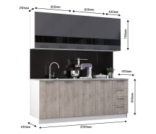 - два верхних шкафа по 800мм и один шкаф на 400 - общая ширина 2000мм Высота 706мм. Глубина 290 мм.