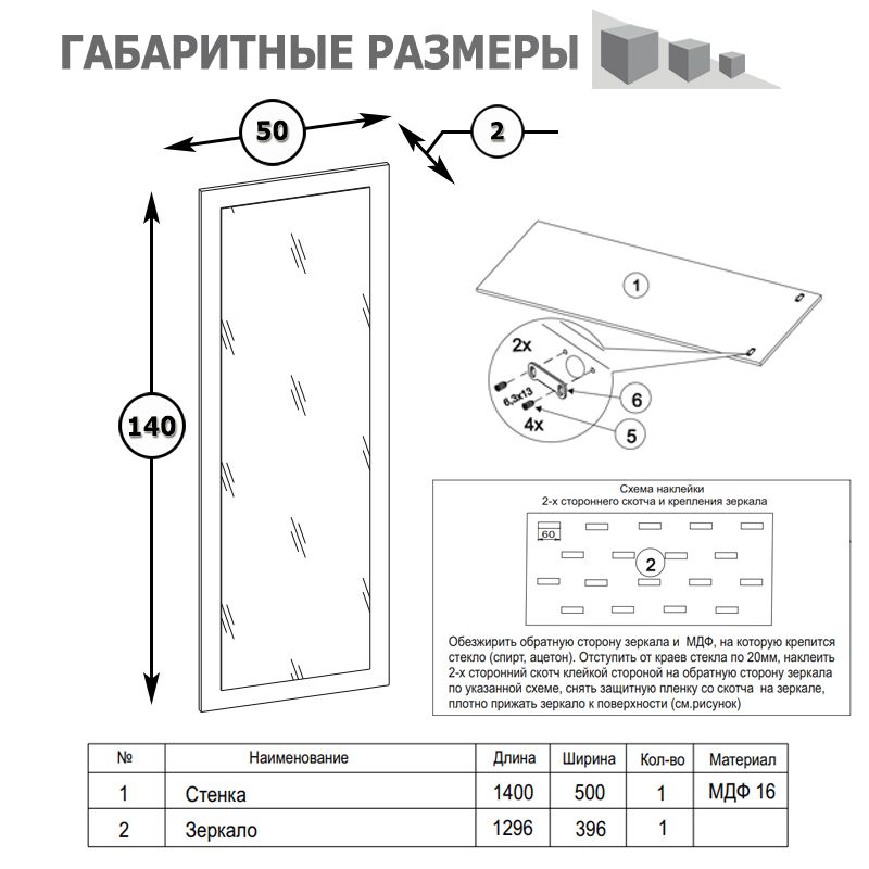 Габариты зеркала (ШхГхВ): 50х2х140 см.