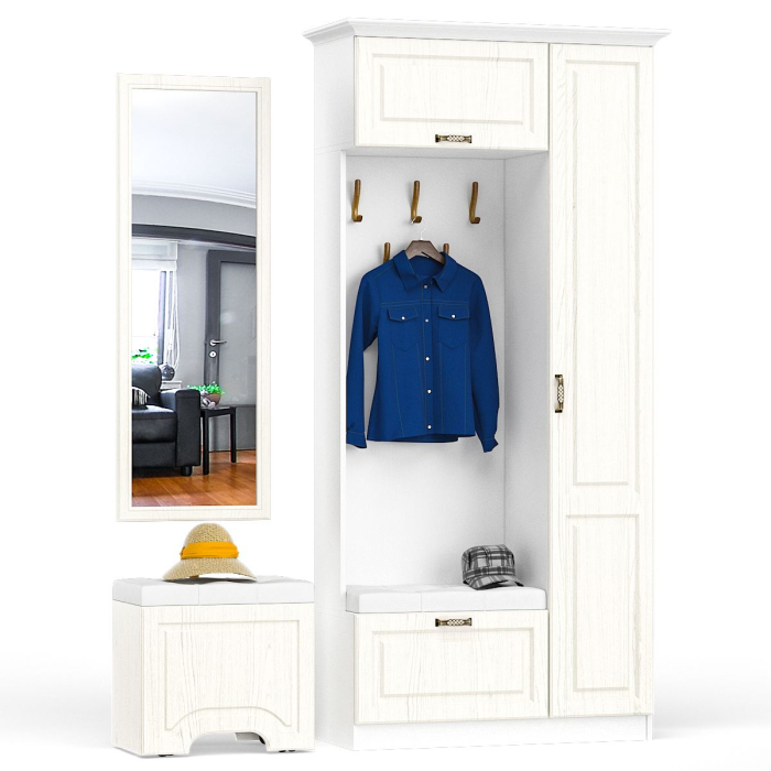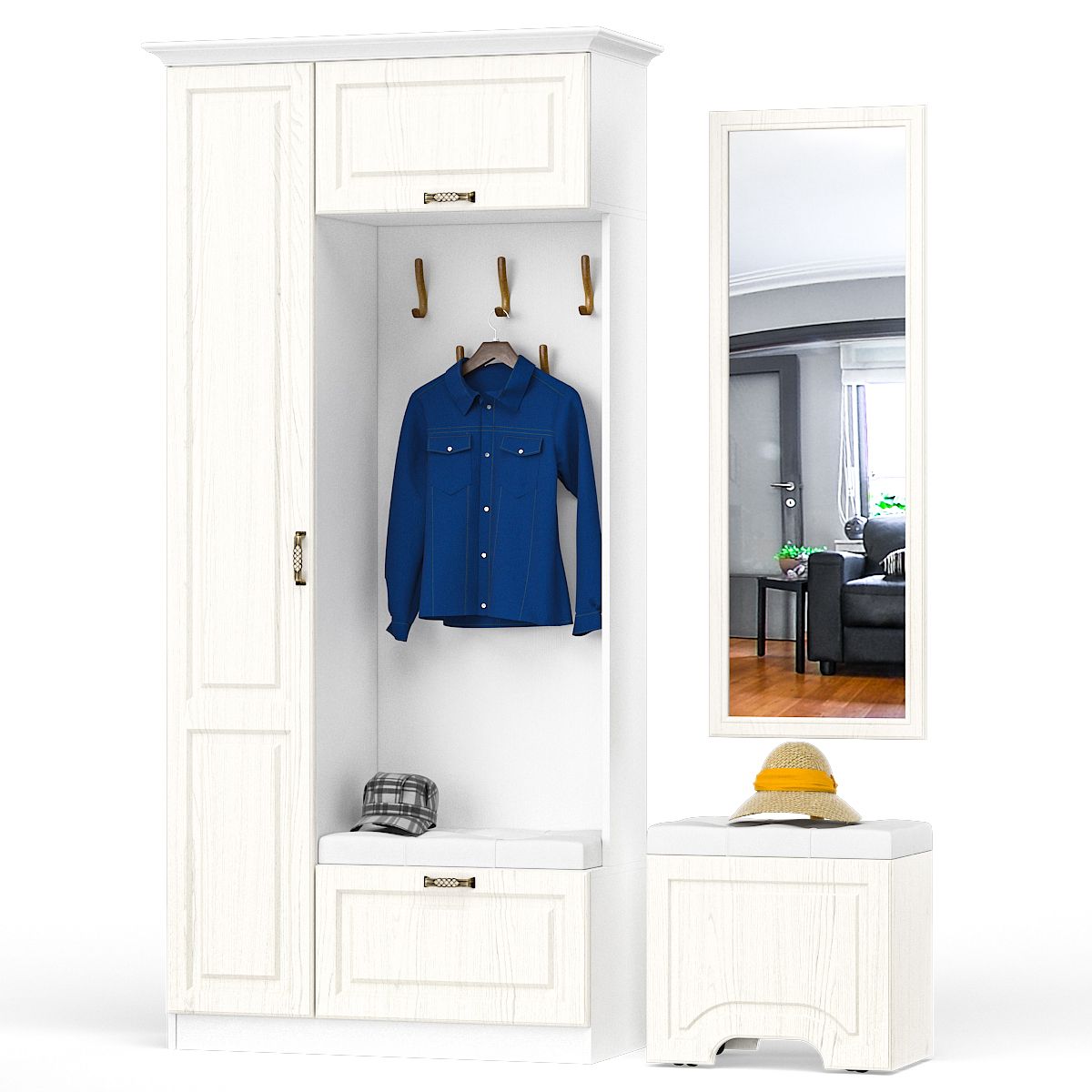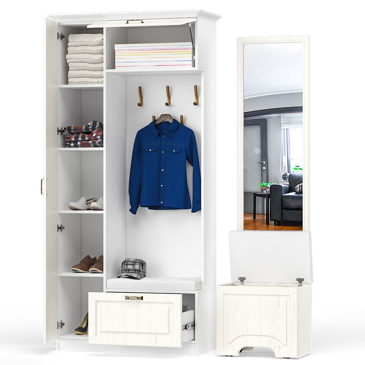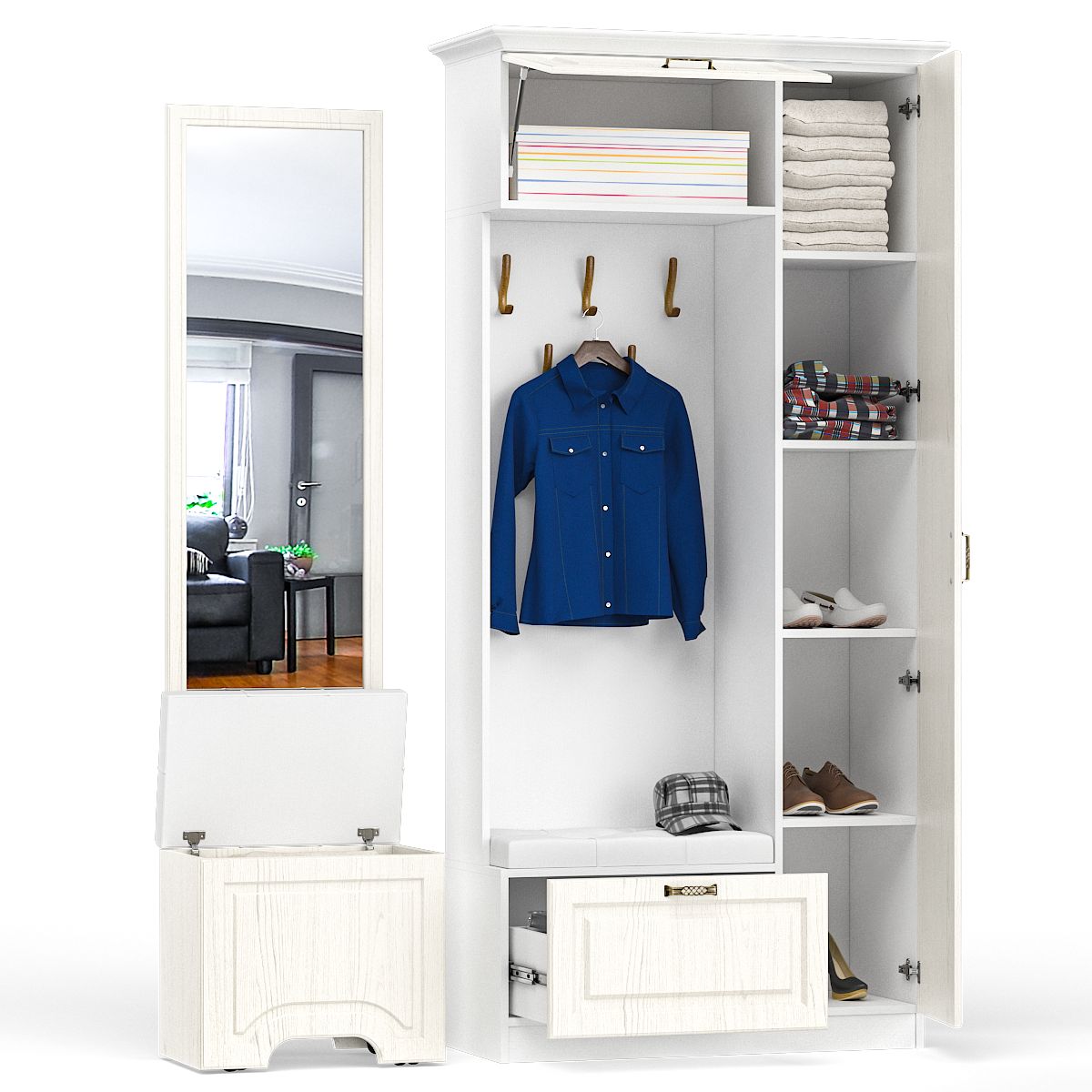 Нарядная, компактная и удобная прихожая Ливерпуль № 1 поселит незабываемый колорит уютного и практичного стиля кантри в Вашем доме. Прихожая Ливерпуль № 1 включающая шкаф многоцелевого назначения с карнизом и пуф с высоким зеркалом - минимум места и максимум услуг! Элегантный шкаф 13.21 удобно комбинирует открытую вешалку с закрытой антресолью и выдвижным ящиком, с распашным шкафом-пеналом. Открытая вешалка с пятью пластиковыми крючками разместит сезонную одежду и аксессуары, антресоль с откидным фасадом - головные уборы. Выдвижной ящик шкафа многоцелевого назначения 13.21 послужит Вам обувницей и банкеткой - крышка ящика облагорожена мягким сидением. Распашной шкаф-пенал оборудован четырьмя полками для вещей. Шкаф многоцелевого назначения 13.21 собирается на любую сторону. Элегантный комплект из трёх карнизов (лицевой и два боковых) довершает эстетический образ многоцелевого шкафа 13.21 Ливерпуль. Карнизы крепятся к верхнему горизонту шкафа многоцелевого 13.21, существенно повышая его «статус» на мебельном Олимпе. Роскошный пуфик с уютной крышкой с мягкой обивкой из белоснежной искусственной кожи, так и манит присесть отдохнуть! Эффектная обивка подъёмной крышки украшена «каретной» стяжкой, под крышкой - вместительное отделение для вещей. Небольшой вес пуфика позволяет с лёгкостью переместить пуф, переобуться, где Вам удобно, и возвратить на его «интерьерное» место! Зеркало навесное высокое Ливерпуль 03.242 - продемонстрирует Вашу элегантность, добавит эффектности и море света в интерьер! Рама зеркала Ливерпуль 03.242 украшена модной глубокой фрезеровкой, края зеркала красиво обработаны фацетом. Универсальная сборка прихожей Ливерпуль № 1 - ещё один шаг к комфорту и уюту даже в крошечной комнате. Нежность пастели мебели, винтажные нотки «состаренного дерева», эксклюзивные ручки - тайна прелести дизайна прихожей Ливерпуль. Сочетание в отделке мебели цвета «ясень» с выразительным рисунком темных прожилок, имитирует объёмность и фактуру крашеного массива. Прихожая Ливерпуль № 1 - это просто, но с налётом шика и роскоши, функционально, но очень стильно, практично, но долговечно!