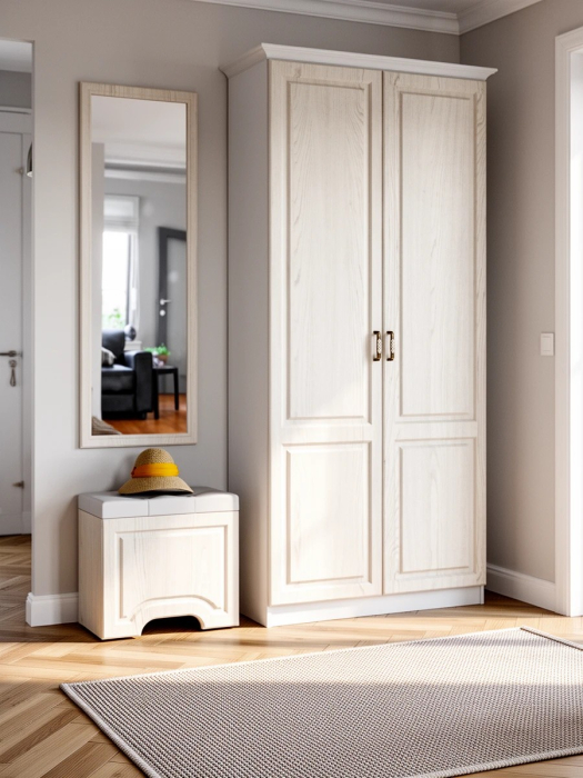 Нарядная, компактная и удобная прихожая Ливерпуль № 3 поселит незабываемый колорит уютного и практичного стиля кантри в Вашем доме. Прихожая Ливерпуль № 3, включающая пуф с высоким зеркалом и шкаф для одежды с карнизом - минимум места и максимум услуг! Шкаф для одежды с карнизом Ливерпуль 13.134 - классический гардероб с оптимальным внутренним наполнением. Двустворчатый распашной шкаф для одежды Ливерпуль 13.134 соединил традиционную практичность с модным внешним лоском. Шкаф имеет три секции - для белья с тремя полками, для одежды на вешалках со штангой и антресольную полку для головных уборов. Элегантный комплект из трёх карнизов (лицевой и два боковых) довершает эстетический образ шкафа для одежды 13.134 Ливерпуль. Карнизы крепятся к верхнему горизонту шкафа для одежды 13.134, существенно повышая его «статус» на мебельном Олимпе. Роскошный пуфик с уютной крышкой с мягкой обивкой из белоснежной искусственной кожи, так и манит присесть отдохнуть! Эффектная обивка подъёмной крышки украшена «каретной» стяжкой, под крышкой - вместительное отделение для вещей. Небольшой вес пуфика позволяет с лёгкостью переместить пуф, переобуться, где Вам удобно, и возвратить на его «интерьерное» место! Зеркало навесное высокое Ливерпуль 03.242 - продемонстрирует Вашу элегантность, добавит эффектности и море света в интерьер! Рама зеркала Ливерпуль 03.242 украшена модной глубокой фрезеровкой, края зеркала красиво обработаны фацетом. Универсальная сборка прихожей Ливерпуль № 3 - ещё один шаг к комфорту и уюту даже в крошечной комнате. Нежность пастели мебели, винтажные нотки «состаренного дерева», эксклюзивные ручки - тайна прелести дизайна прихожей Ливерпуль. Сочетание в отделке мебели цвета «ясень» с выразительным рисунком темных прожилок, имитирует объёмность и фактуру крашеного массива. Прихожая Ливерпуль № 3 - это просто, но с налётом шика и роскоши, функционально, но очень стильно, практично, но долговечно!