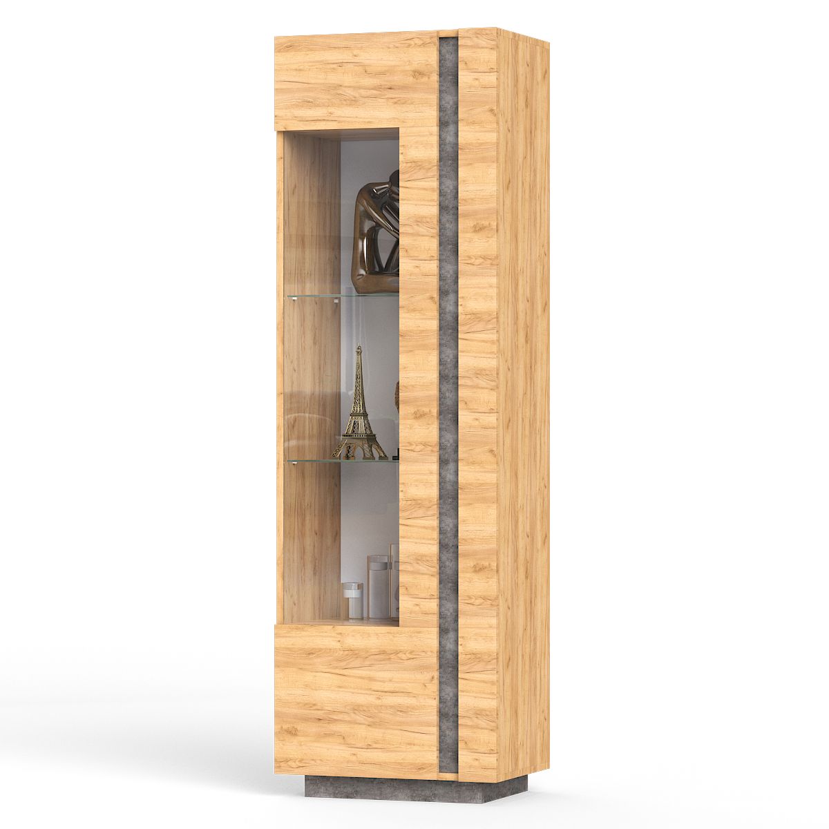 В данной комплектации мебель в гостиную Арчи № 5 включает тумбу ТВ, шкаф-витрину с подсветкой и полку. Гостиная Арчи № 5 выглядит ярко и сдержанно одновременно, что весьма модно и актуально на нынешнем рынке мебели. Дизайн мебели для гостиной Арчи сочетает прямые геометрические формы, высокий функционал, интересное цветовое и фактурное решение. Ламинированная ДСП, из которой изготовлена мебель для гостиной Арчи, имеет вид тёплого дерева и холодного камня. Множество стеклянных элементов, акцентированных светодиодной подсветкой, визуально соединяют камень и дерево в единую композицию. Компактный, оптимальной комплектации, набор мебели в гостиную № 5 имеет просторную нишу для телевизора и систему хранения аксессуаров. Широкая невысокая тумба ТВ с открытой полкой и шкафом-витриной с большим вкусом и комфортом обустроят зону отдыха в Вашей гостиной. Нижняя часть тумбы ТВ представлена закрытой распашной дверкой нишей, открытой нишей со стеклянной полочкой и светодиодной подсветкой. Стильная навесная полочка для книг, гаджетов и предметов декора органично дополняет тумбу, в эстетическом и функциональном аспектах. Шкаф-витрина украшен оригинальной стеклянной вставкой на фасаде, за которой расположены стеклянные полочки со светодиодной подсветкой.