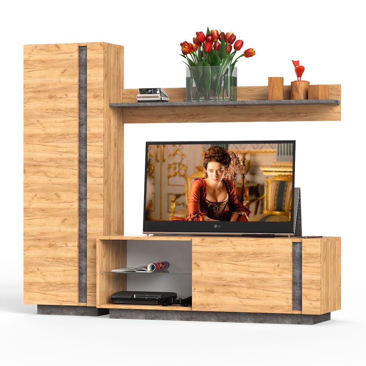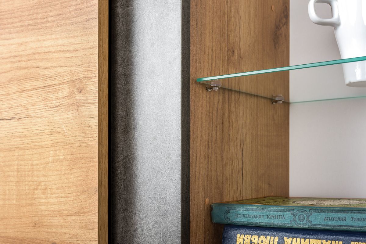 В данной комплектации мебель в гостиную Арчи № 8 включает тумбу ТВ, шкаф комбинированный и полку. Гостиная Арчи № 8 выглядит ярко и сдержанно одновременно, что весьма модно и актуально на нынешнем рынке мебели. Дизайн мебели в гостиную Арчи сочетает прямые геометрические формы, высокий функционал, интересное цветовое и фактурное решение. Ламинированная ДСП, из которой изготовлена мебель в гостиную Арчи, имеет вид тёплого дерева и холодного камня. Стеклянные элементы тумбы, акцентированных светодиодной подсветкой, визуально соединяют камень и дерево в единую композицию. Компактный, оптимальной комплектации, набор мебели в гостиную № 8 имеет просторную нишу для телевизора и систему хранения аксессуаров. Широкая невысокая тумба ТВ с открытой полкой и распашным шкафом с большим вкусом и комфортом обустроять зону отдыха в Вашей гостиной. Нижняя часть тумбы ТВ представлена закрытой распашной дверкой нишей, открытой нишей со стеклянной полочкой и светодиодной подсветкой. Стильная навесная полочка для книг, гаджетов и предметов декора органично дополняет тумбу, в эстетическом и функциональном аспектах.