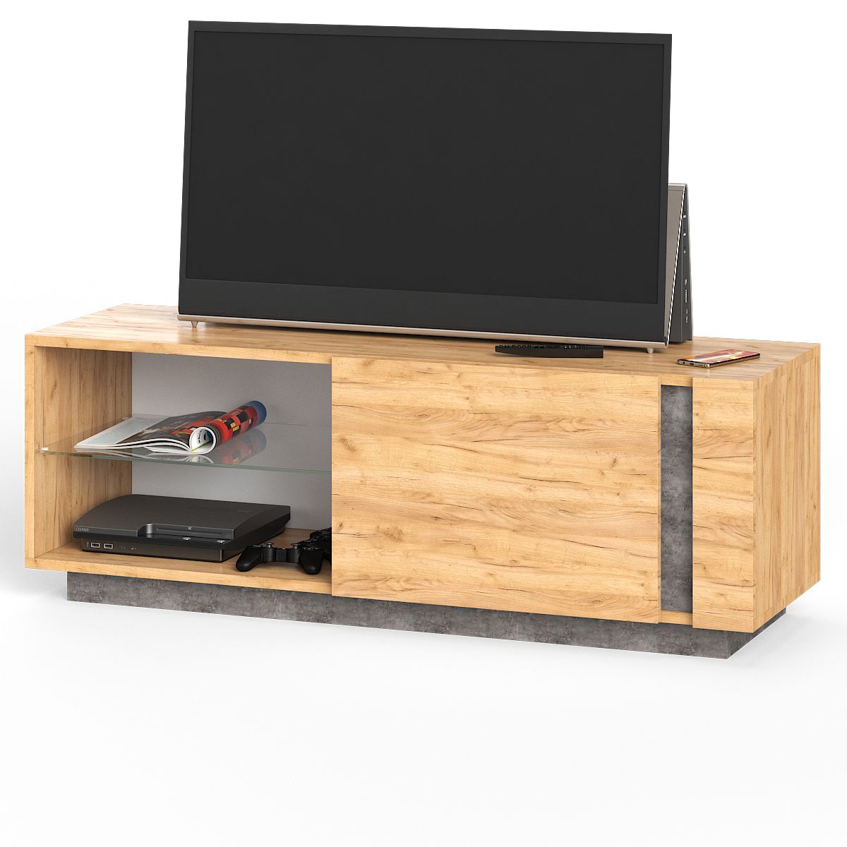 Тумба ТВ Арчи 10.85 - широкая невысокая тумба поможет с большим вкусом и комфортом обустроить зону отдыха в Вашей гостиной. На верхнем горизонте тумбы достаточно места для телевизора любой диагонали. Нижняя часть тумбы представлена закрытой распашной дверкой нишей и открытой нишей со стеклянной полочкой и светодиодной подсветкой. Тумба ТВ Арчи 10.85 - модуль из набора мебели для гостиной Арчи.