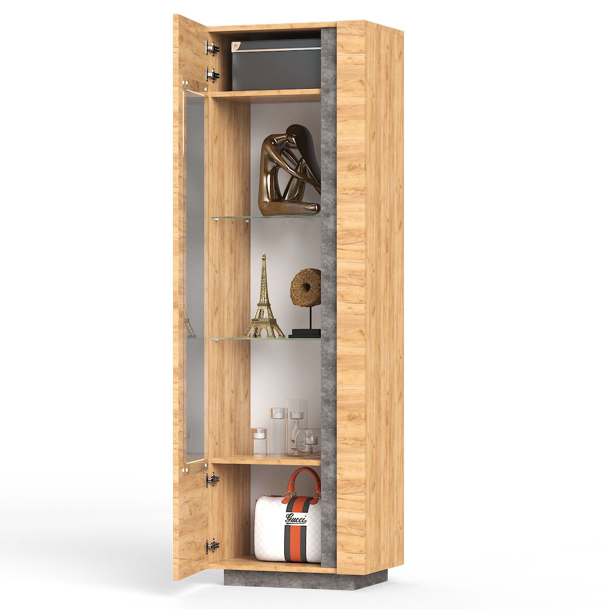 Шкаф-витрина с подсветкой Арчи 03.263 дуб крафт золотой/камень тёмный - высокий шкаф-витрина украсит Ваш дом и станет ярким мебельным акцентом в интерьере гостиной. Дизайн шкафа отличается оригинальной стеклянной вставкой на фасаде, за которой расположены стеклянные полочки, декорированные светодиодной подсветкой. Вы можете использовать шкаф-витрину в качестве серванта, витрины, буфета, хранить в нём вещи, книги, одежду, документы. Назначение шкафа-витрины универсально. Подсветка полочек поможет создать романтическую обстановку в вечернее время суток без использования дополнительных источников света. Шкаф-витрина с подсветкой Арчи 03.263 - модуль из набора мебели для гостиной Арчи.