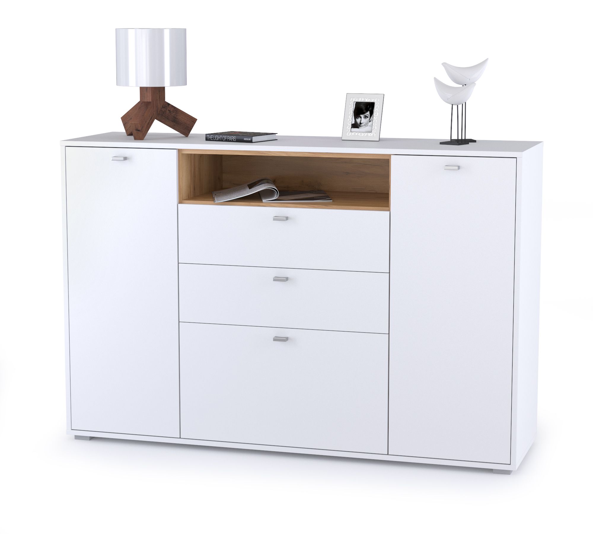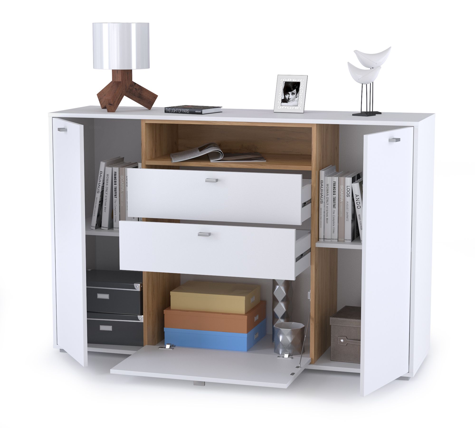 Комод Бэль 10.95 дуб крафт золотой/белый премиум - стильный, эргономичный и многофункциональный - новое прочтение традиционных элементов обстановки. Солидный комод Бэль удобно комбирует два распашных отделения, нишу за откидным фасадом, открытую нишу и два выдвижных ящика. Элегантность белоснежного комода Бэль, стильно дополнена фактурной отделкой открытой ниши. За распашными дверками по одной полке. Комод Бэль в гостиную - модуль из набора мебели для гостиной Бэль.
