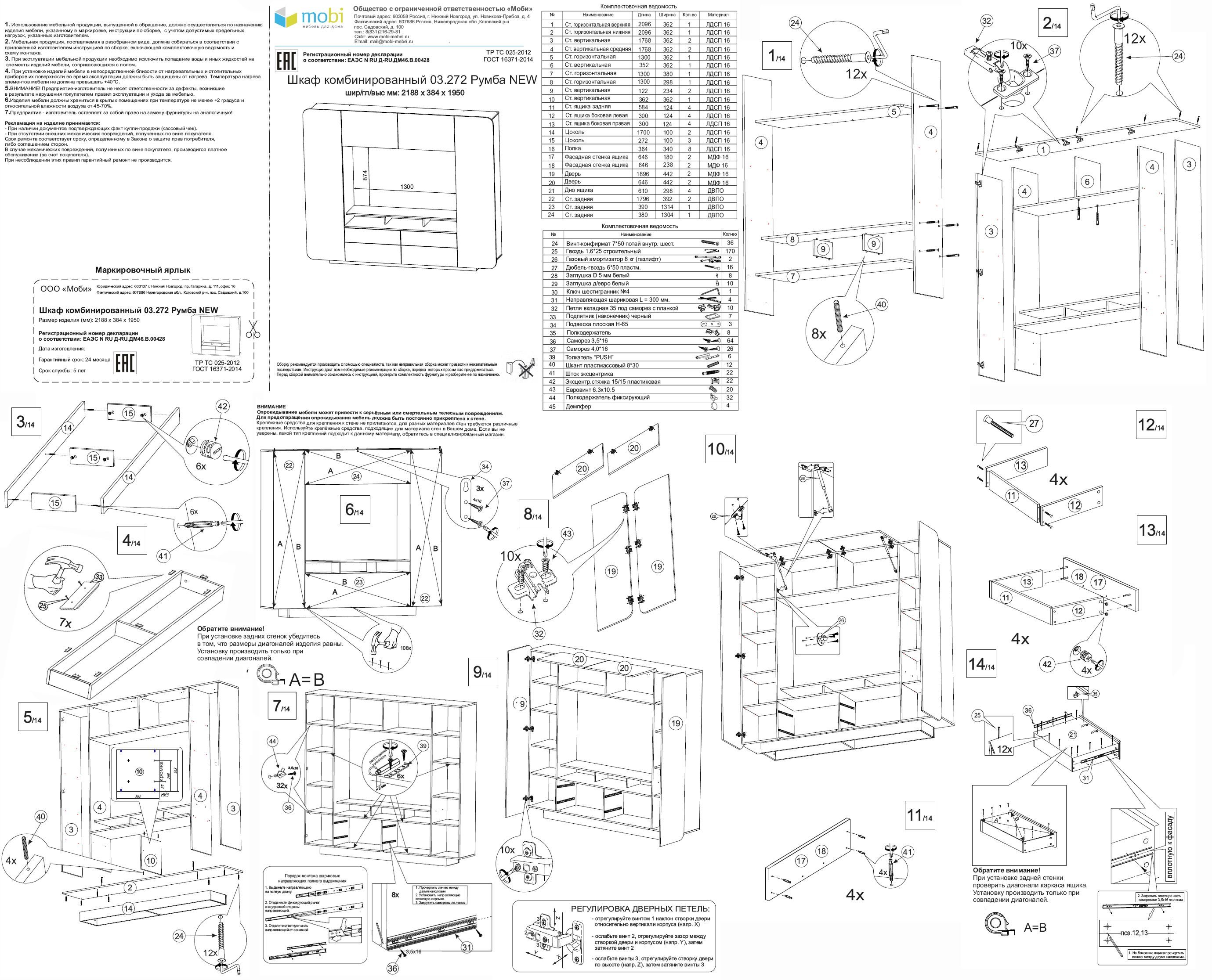 Изготовлена гостиная из современных материалов, на компьютеризированном оборудовании с непрестанным контролем качества. Корпус мебели выполнен из ламинированной ДСП 16 мм., фасады - плиты МДФ 16 мм., торцы деталей закромлены плёнкой ПВХ. Распашные двери закреплены на четырёхшарнирных петлях без доводчиков, выкатные ящики - на шариковых направляющих, для открывания используется механизм Push. Верхние горизонтальные откидные двери фиксируются газлифтами, открываются за край фасада. Поставка мебели производится в разобранном виде, в надёжной упаковке, инструкция по сборке и необходимая фурнитура прилагаются.