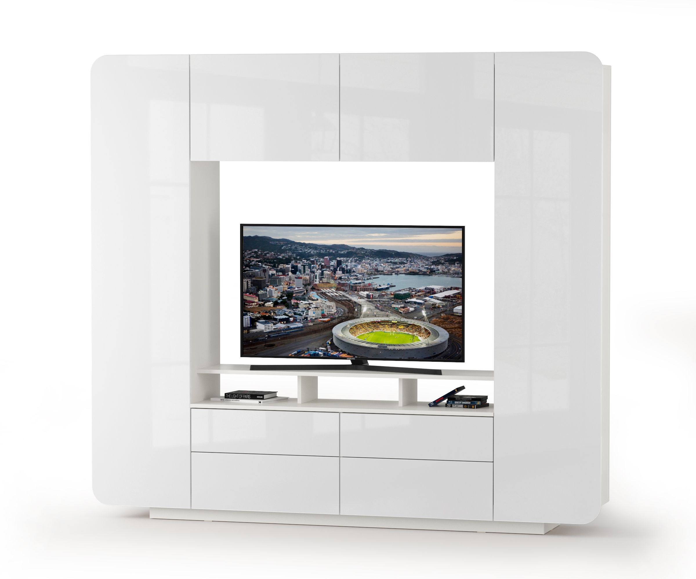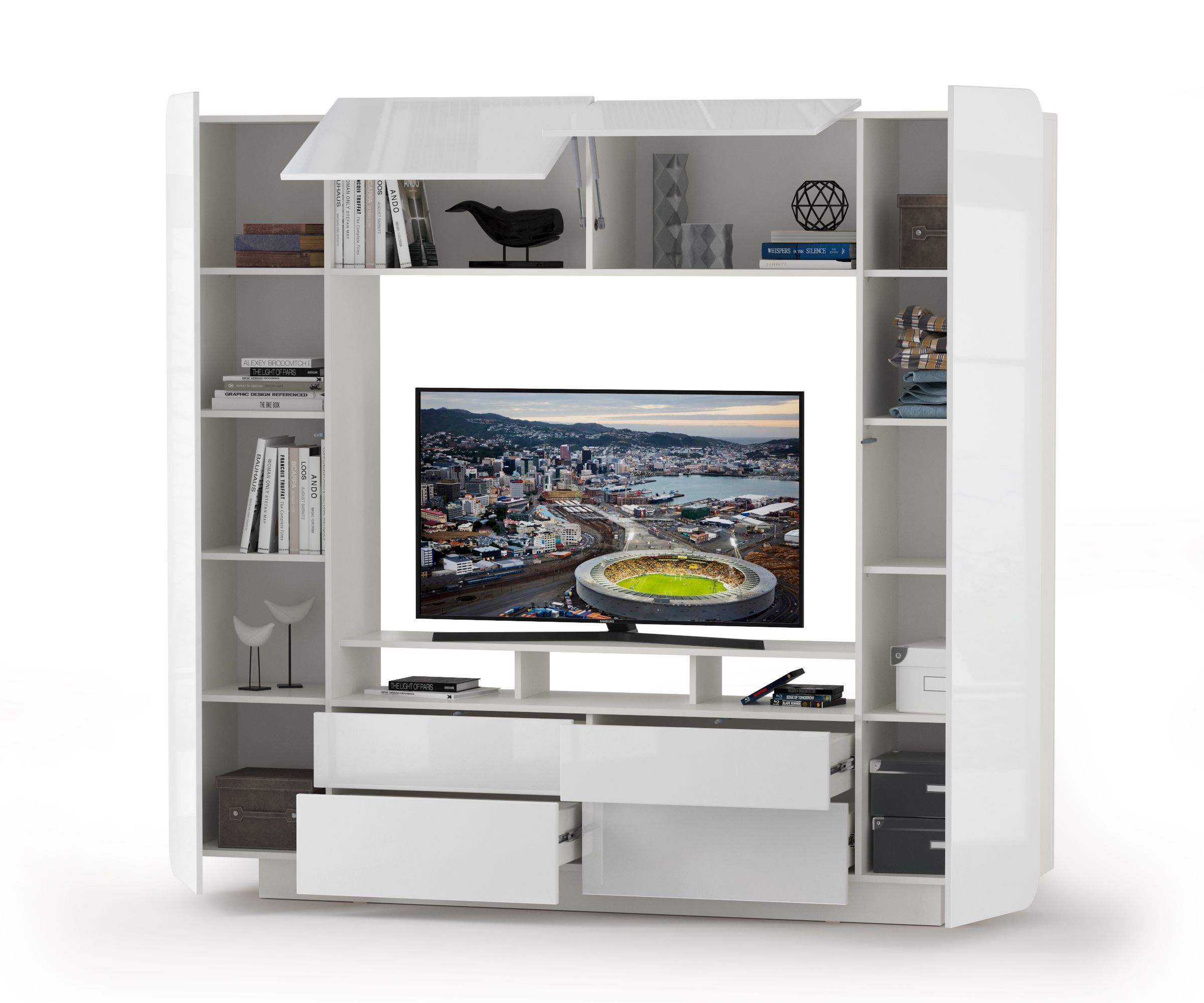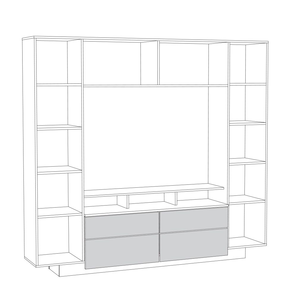 За распашными дверками шкафов расположены по 4 полочки в каждом, за откидными дверками полки - закрытые отделения. Тумбочка располагает четырьмя выдвижными ящиками и открытой полочкой, установленной на пару вертикальных перегородок, образующих с верхним горизонтом тумбы три ниши. Все элементы абсолютно симметричной гостиной образуют нишу для телевизора размером 130х38х87 см. в самом центре. Гостиная достаточно вместительная и функциональная имеет глубину всего 38 см., что позволяет использовать её и в помещениях с весьма ограниченной площадью.