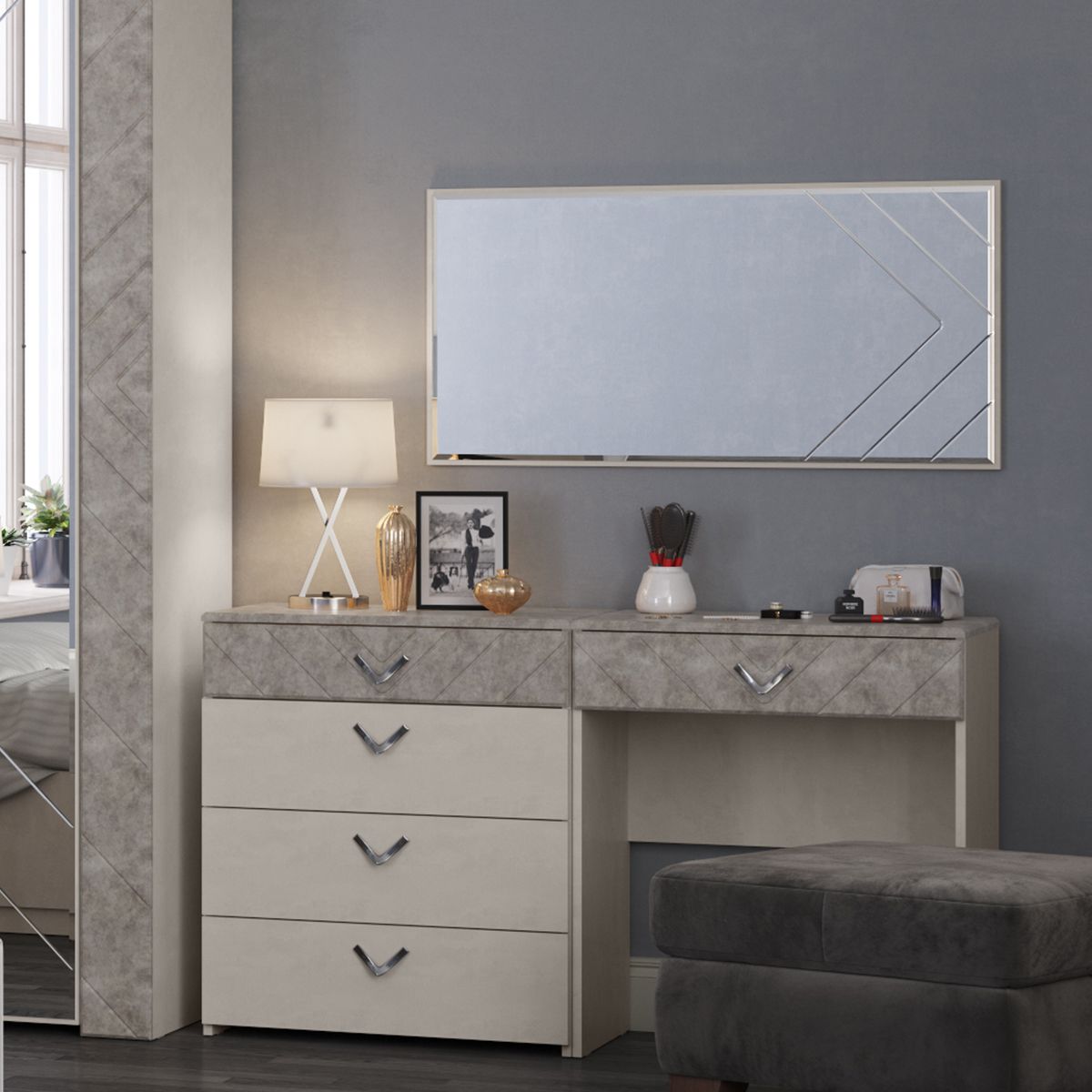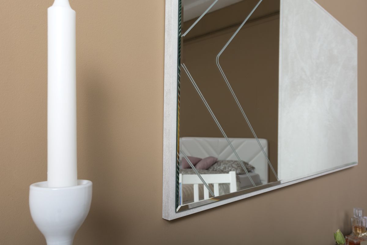 Зеркало навесное Амели 03.240 шёлковый камень - большой размер, оптимальная форма и оригинальный дизайн. Прямоугольная форма зеркала позволяет повесить его как горизонтально, так и вертикально, согласно Вашему дизайн-проекту. Зеркальное полотно украшено зигзагами и полосками фрезеровки, характерными всегда модному стилю арт-деко.