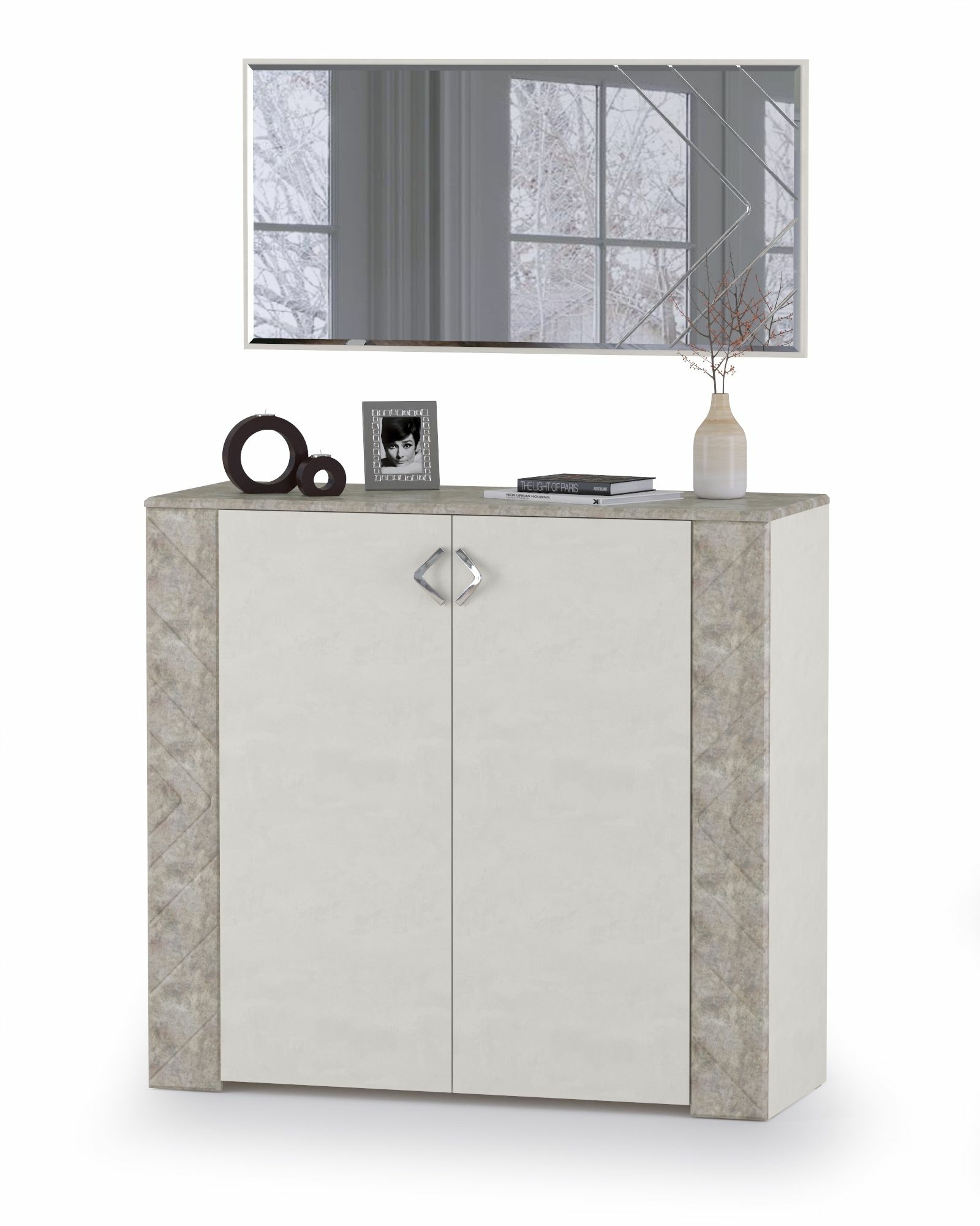 Комод с дверками с зеркалом Амели 13.107+03.240 шёлковый камень/бетон чикаго беж - лично для милых Дам, красавиц и хозяюшек! Элегантная комод с двумя полками за распашными дверками, бережно сохранит вещи и послужит чудесным подзеркальником уголка Красоты. Зеркало навесное Амели 03.240, большой размер, оптимальная форма и оригинальный дизайн - идеальная пара комоду с дверками. Прямоугольная форма зеркала позволяет повесить его как горизонтально, так и вертикально, согласно Вашему дизайн-проекту. Зеркальное полотно и фасады комода украшены зигзагами и полосками фрезеровки, характерными всегда модному стилю арт-деко. Комод с дверками с зеркалом Амели - элементы из набора мебели для спальни Амели Моби.