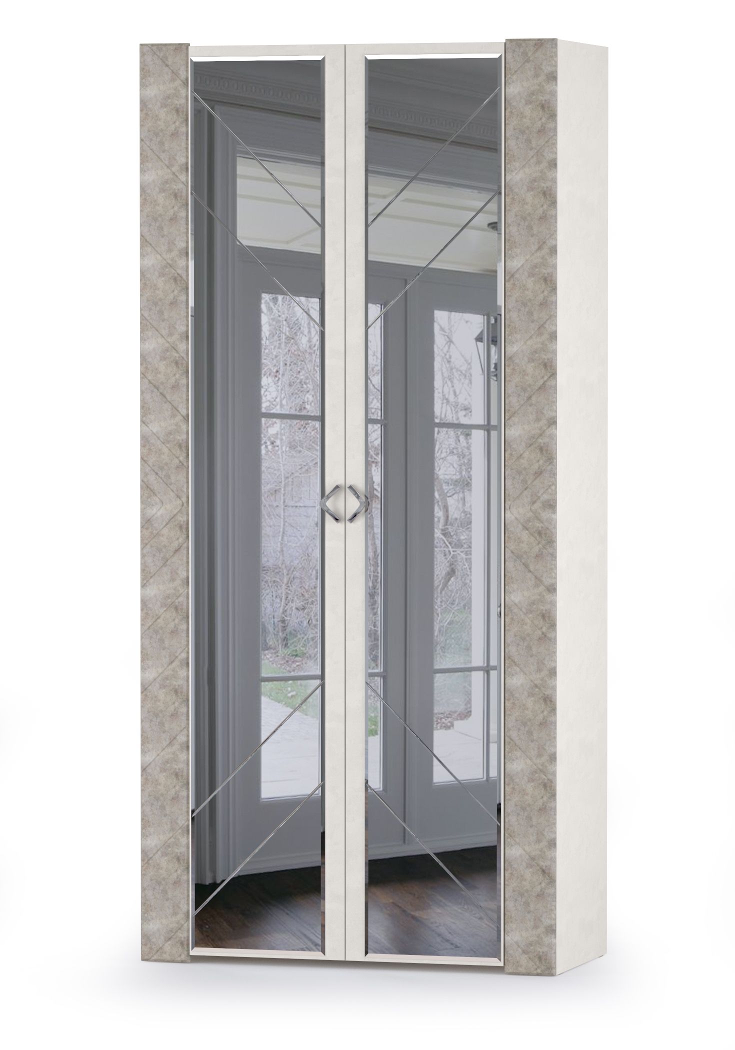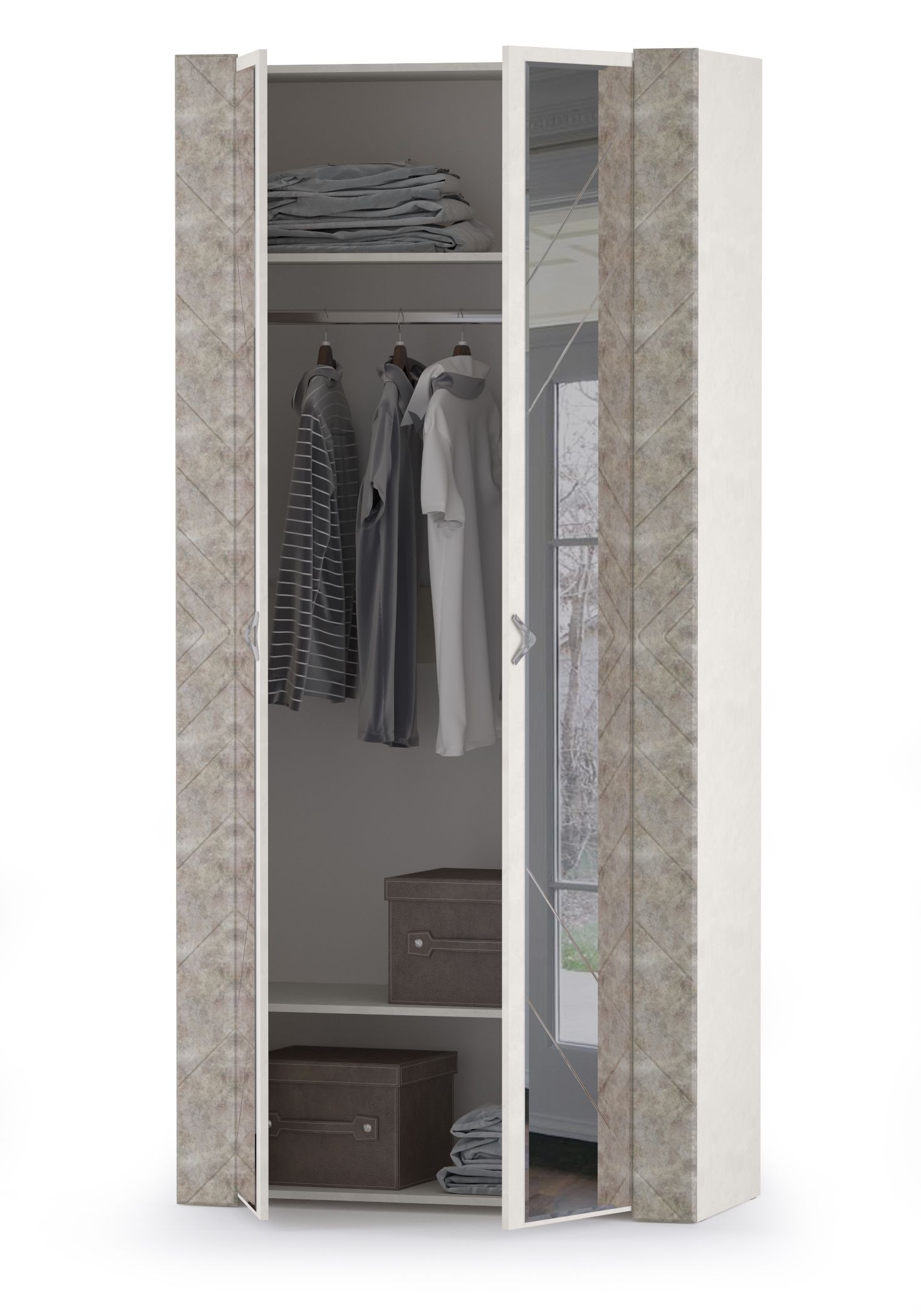 Шкаф для одежды Амели 13.133 шёлковый камень/бетон чикаго беж - высокий, двустворчатый шкаф с отличной вместимостью. Удобный распашной шкаф для одежды Амели 13.133 оборудован двумя полками и горизонтальной штангой для вешалок. Обе двери шкафа для одежды декорированы зеркалом, во всю длину двери, что позволит Вам выбрать наряд прямо «на одном месте»! Зеркальное полотно и фасады шкафа украшены зигзагами и полосками фрезеровки, характерными всегда модному стилю арт-деко. Шкаф для одежды Амели 13.133 - элемент из набора мебели для спальни Амели Моби.