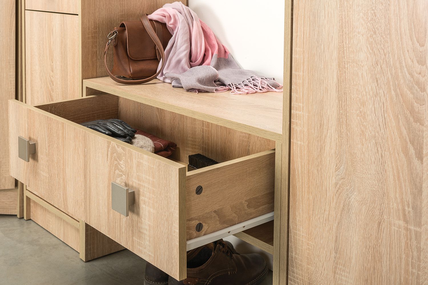 Описание прихожей Глория 2: Прихожая Глория 2 - классическая линия мебели для современного интерьера. Данная прихожая представлена 10 модулями - зеркало, вешалка, комод, угловой стеллаж и по три варианта тумб и шкафов - на выбор! Различные сочетания элементов помогут уютно и функционально обустроить прихожую любых размеров дома или офиса. Глубина Глории 2 всего 36 см., вместе с тем, прихожая вместительна, устойчива и удобна в эксплуатации. Респектабельный вид, прямые формы и спокойная пастель цветовой гаммы помогут Глории 2 гармонично вписаться в интерьер. Прихожая Глория 2 произведена на современном высокоточном европейском оборудовании фирмы «BIESSE» (Италия). Процесс изготовления мебели компьютеризирован, что гарантирует точность соблюдения размеров, обеспечивает быструю, лёгкую сборку. В производстве мебели использованы высококачественные материалы и фурнитура «Hettich» - мировая гарантия качества, проверенная временем. Выполнена прихожая Глория 2 из ламинированной ДСП, которая имеет гигиенический сертификат Е1 и относится к самой безопасной группе ДСП. Торцы деталей облицованы кромкой ПВХ 2 мм. и 0,4 мм. фирмы «Rehao», что улучшает эстетический вид и продлевает срок службы прихожей. Металлические, оригинальной формы крючки вешалки и ручки мебели, нарядного, белого цвета, украшают и освежают дизайн фасадов. Выдвижные ящики тумб и комода установлены на металлические направляющие, обеспечивающие надёжное прямолинейное движение. На опорах мебели используются пластиковые подпятники, сохраняющие Ваше напольное покрытие от повреждений. Модули прихожей Глория 2 поставляются в разобранном виде, упакованные в 4-х слойный гофрокартон, с комплектом фурнитуры и инструкцией по сборке. На каждом этапе производства мебель Глория 2 прошла контроль качества и заслуженно сертифицирована на соответствие современными стандартами. Линия мебели Глория 2 представлена в двух модных, красивых цветах - дуб сонома и дуб кальяри.