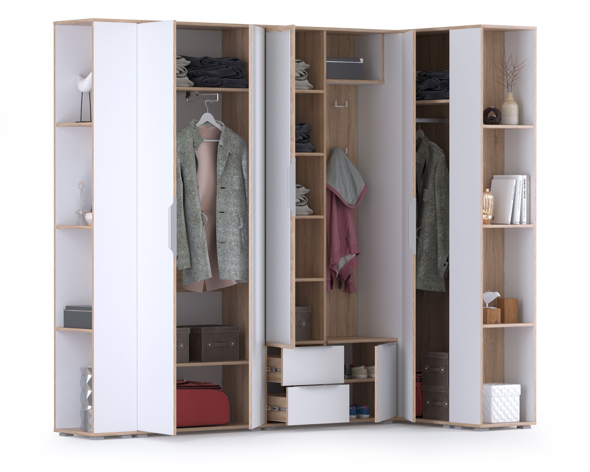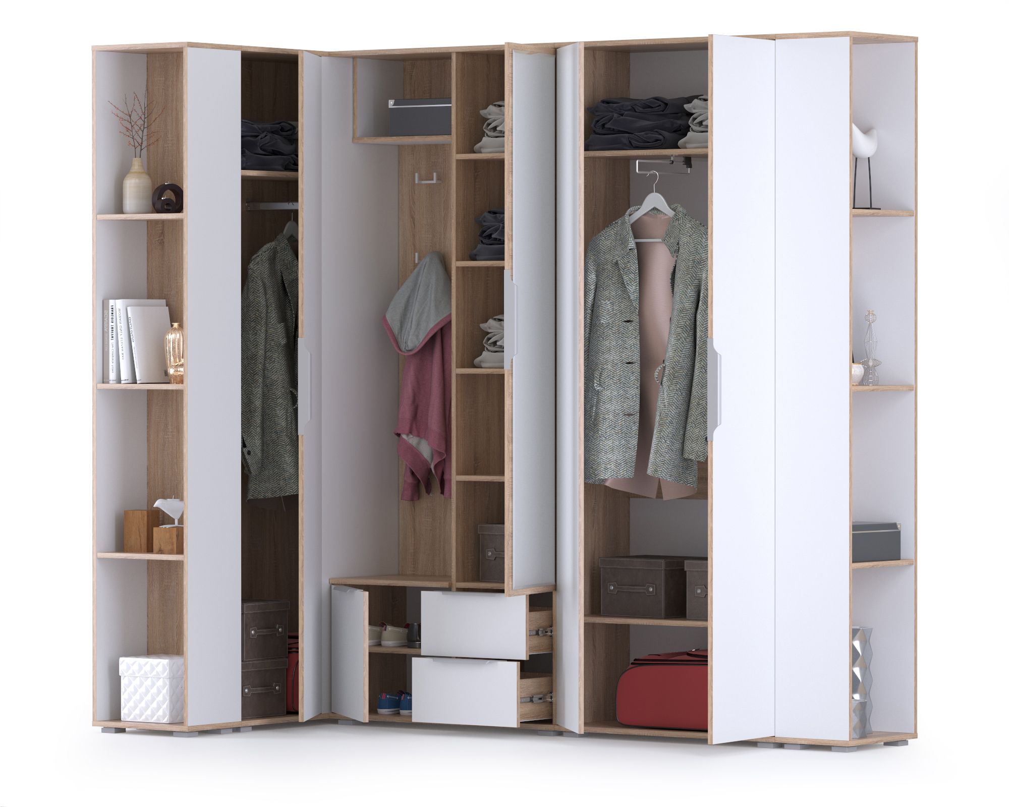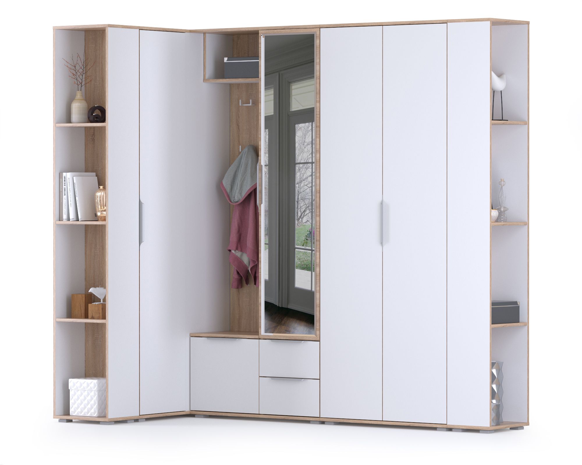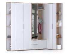 Угловая прихожая с зеркалом и окончанием Куба НМ № 16 - вместительный и эргономичный гарнитур для средних и больших помещений. Прихожая Куба № 16 создаст комфортный, функциональный и безопасный интерьер, украсит уникальной эстетикой белоснежных фасадов. Угловая конструкция прихожей Куба № 16 позволяет, используя труднодоступные места помещения, создать вместительную систему хранения. Комплектация угловой прихожей Куба № 16 включает шкаф комбинированный, шкаф угловой, двустворчатый шкаф и два открытых стеллажа. Такая разноплановость элементов прихожей Куба № 16, позволяет бережно относится к своему гардеробу и содержать дом в порядке. Многофункциональный шкаф Куба 10.14 удобно комбинирует открытую вешалку и одностворчатый шкаф с двумя выдвижными ящиками. Распашная дверь одностворчатого шкафа декорирована зеркалом во всю её длину, внутри шкаф оборудован тремя съёмными полками. Большое зеркало шкафа - непременный элемент прихожей, помогающий Вам выглядеть идеально и освежающий интерьер. Открытая вешалка, с четырьмя крючками для одежды, имеет антресольную полку для головных уборов и распашное отделение для обуви. Оба шкафа угловой прихожей Куба 16 оборудованы штангами для вешалок с одеждой - двустворчатый выдвижной, угловой - горизонтальной. Верхнюю одежду можно проветрить и просушить на открытой вешалке, после чего убрать в один из шкафов прихожей - для сохранения формы. Дополнительно в шкафах предусмотрены полки, выделяющие отдельные ниши для вещей, обуви, головных уборов и аксессуаров. Два открытых стеллажа Куба 13.141 с тремя полочками внесут визуальную лёгкость в оформление прихожей, добавит комфорт и стиль. Универсальная сборка набора мебели угловой прихожей Куба № 16 позволит составить максимально эргономичный гарнитур. Дизайнеры прихожей Куба, объединив эстетику и передовую технологию, создали элегантный гарнитур в современной стилистике. Пастель и древесная фактура корпусов прихожей Куба согревают природной теплотой визуальную прохладу белоснежных фасадов мебели. Актуальный тренд - минимальное декорирование мебели позволяет сформировать лаконичные, интересные ансамбли для любых помещений. Незамысловатые формы и абсолютная эргономичность прихожей Куба делают благородную элегантность интерьеров по-домашнему уютной.