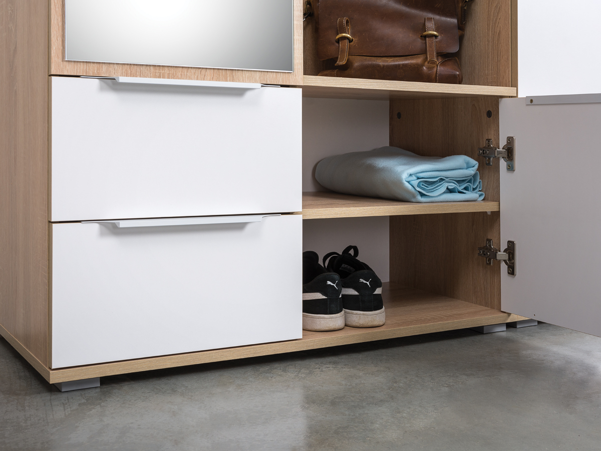 Корпуса и фасады мебели Куба выполнены из ламинированной ДСП 16 мм. Опоры - серый пластик, лицевая фурнитура - металл, цвет белый. Современная фурнитура, использованная в производстве прихожей Куба № 17, отличается высокой надёжностью и долговечностью. Распашные двери модулей прихожей Куба на четырёхшарнирных петлях, выдвижные ящики на шариковых направляющих полного выдвижения. Прихожая Куба № 17 поставляется в разобранном виде, с комплектом фурнитуры, упакованная в 4-х слойный гофрокартон. Соответствие ГОСТам и требованиям Таможенного Союза прихожей Куба №17 и материалов их производства подтверждено сертификатами.