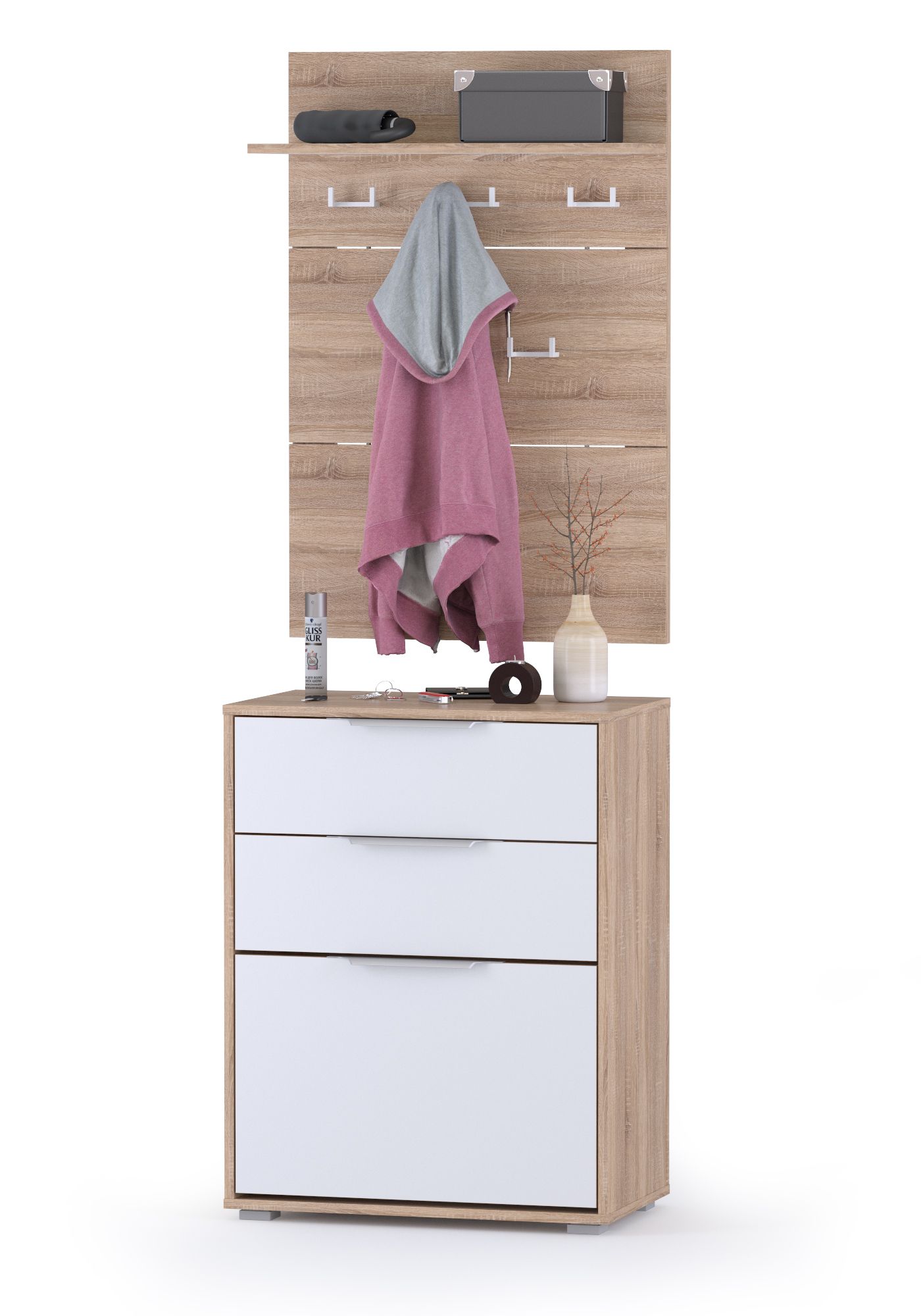 Обувница с ящиками с вешалкой для одежды Куба № 6 - функциональный набор мебели для больших и малых прихожих. Стильная обувница широкая Куба оборудована двумя выдвижными ящиками для мелочей и нишей для обуви за откидным фасадом. Откидная дверь обувницы широкой Куба снабжена механизмом со специальными полками для размещения обуви. Удобная высота обувницы широкой Куба, 84 см., позволит использовании её в качестве подставки для сумок и пакетов. Вешалка для верхней одежды Куба Полка 10.122 - разумная традиция хранения сезонной одежды. Открытая вешалка выполнена в виде панели из трёх полос, соединённых вставками, что визуально разгружает изделие. Настенная вешалка оборудована пятью стильными, пластиковыми двухрожковыми крючками для одежды, сумок и зонтиков. Полка, расположенная над крючками вешалки Куба 10.122, предназначена для хранения головных уборов. Обувница с ящиками с вешалкой для одежды Куба - элементы из набора мебели для прихожих Куба.