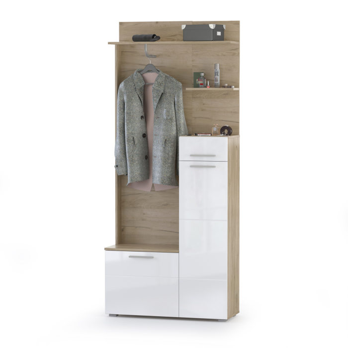Мини-прихожая Лайн 10.16 - практичный подход к сезонному хранению вещей. Рекомендуем обратить внимание на мини прихожую Лайн 10.16, ценную компактностью и эргономикой обустраиваемой зоны. Прихожая Лайн 10.16 представляет собой панель, комбинирующую открытую вешалку и две распашные тумбы с внутренними полками. Креативное решение обустройства открытой вешалки позволяет одежде лучше проветриться, быстрее просохнуть и сохранить форму. Вешалка имеет антресольную полочку для головных уборов, которая закреплена на металлическом полкодержателе. Форма полкодержателя выполнена так, что может использоваться в качестве штанги для развешивания одежды на плечиках. На лицевой панели прихожей Лайн 10.16 предусмотрена пара крючков для размещения сумочек или зонтиков и полочка для мелочей. Обе тумбы прихожей Лайн 10.16 послужат отличным местом хранения обуви и других сезонных вещей, низкая тумба ещё и удобная банкетка. Высокая тумба с ящиком и двумя полками расположена с правой стороны прихожей, низкая с полкой - с левой. Универсальной сборки нет. Выдвижной ящик высокой тумбы прихожей Лайн 10.16 удобный для ключницы, аксессуаров по уходу за обувью и одеждой, мелочей. Прихожая Лайн 10.16 установлена на пластиковые опоры высотой 20 мм и обязательно крепится к стене. Современный стиль, простота формы и модная цветовая гамма делает прихожую Лайн 10.16 прекрасным дополнением любого интерьера.