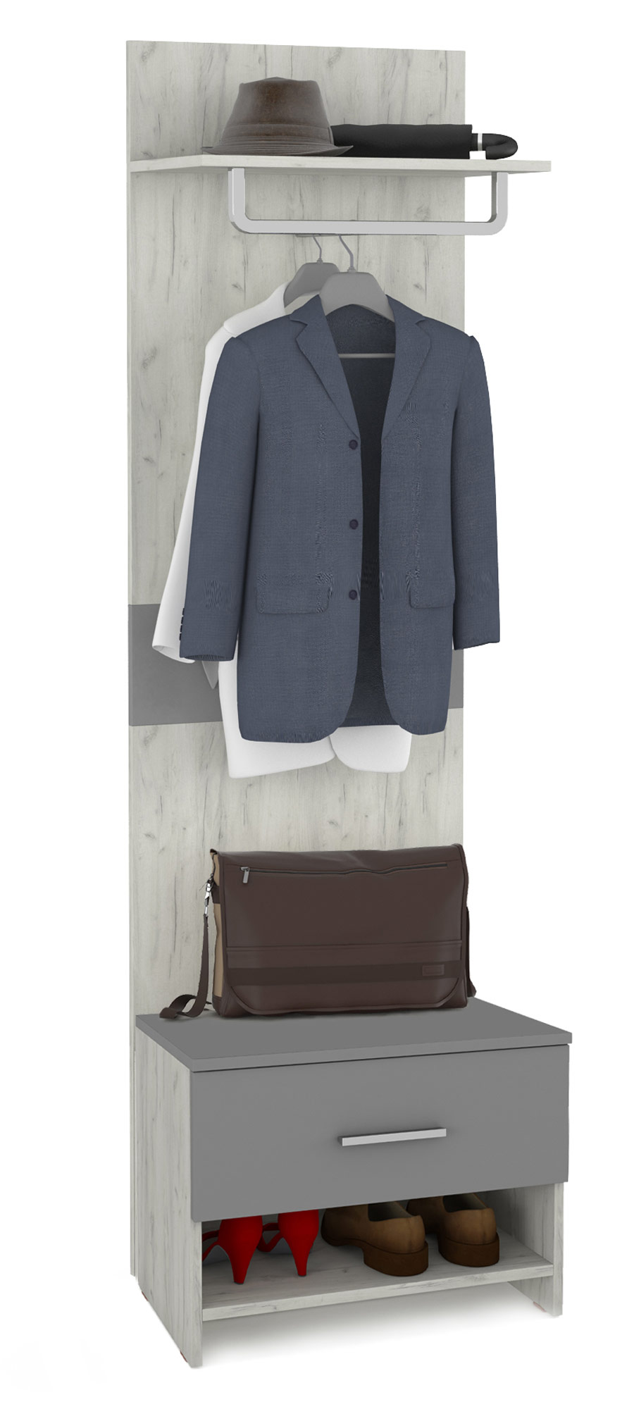 Юнона Прихожая 2 - компактная красивая прихожая для уютного дома. Данная прихожая состоит из тумбы для обуви и открытой вешалки. Тумба имеет выдвижной ящичек для необходимых мелочей и открытую нишу для хранения обуви. При весьма компактных размерах, тумба достаточно устойчива, чтобы служить банкеткой. Открытая вешалка поможет поддержать чистоту в прихожей и обеспечить сохранность Ваших вещей. Вешалка имеет антресольную полочку для головных уборов, которая закреплена на металлическом полкодержателе. Форма полкодержателя выполнена так, что может использоваться в качестве штанги для развешивания одежды на плечиках. Кроме того, на лицевой панели есть пара крючков для размещения сумочек или зонтиков. Юнона Прихожая 2 состоит из элементов набора мебели для прихожих Юнона.