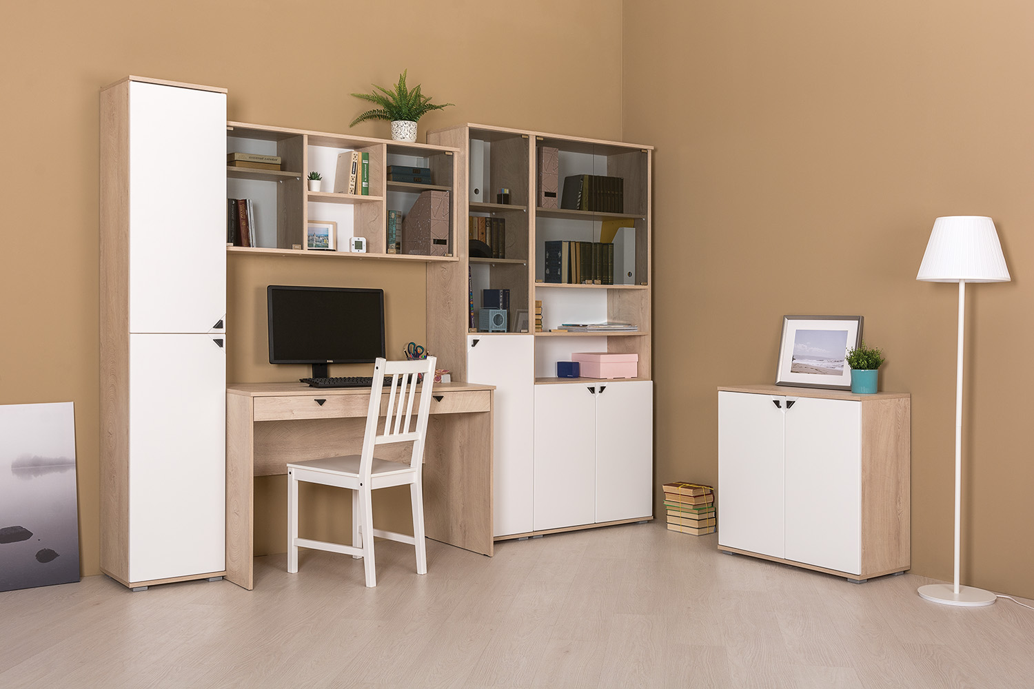 Описание коллекции мебели для домашнего офиса Бостон: Домашний офис Бостон - коллекция удобной и функциональной мебели для современного рабочего места. Серию Бостон составляют 7 практичных модулей, компонуя которые, можно составить комплект мебели в соответствии с Вашим желанием и выделенным бюджетом. Компьютерный стол, открытая и закрытая полочки, три шкафа и комод помогут реализовать Ваш проект, и составят эргономичную обстановку домашнего офиса. Модули практичны, имеют универсальную сборку, что расширяет варианты компоновок и расположения в интерьере кабинетов, составляя максимально комфортную рабочую атмосферу. Стильный дизайн мебели Бостон подчёркнут сочетанием красивого древесного цвета корпуса, белых фасадов, чёрных матовых металлических ручек, расположенных в специальных угловых углублениях на дверках и онированного стекла витрин, открывающихся при помощи механизма push (нажмите на уголок и дверка откроется). Современный процесс производства мебели при постоянном контроле качества результатов и материалов гарантируют длительный срок службы и соответствие высоким стандартам. Корпус мебели Бостон изготовлен из ламинированной ДСП 16 мм., сертифицированной к изготовлению детской мебели. Глухие дверки шкафов и комода выполнены из прочной и экологичной МДФ плиты, ламинированной плёнкой ПВХ с тактильно приятным покрытием софт-тач. Торцы деталей мебели защищены кантом ПВХ 0,4 мм. и 2 мм, украшающим изделия, защищающим от механических повреждений и продлевающим срок службы. В сборке мебели используется фурнитура высокого качества проверенных временем поставщиков. Глухие распашные двери закреплены на четырёхшарнирных петлях, дверки-витрины из тонированного стекла - на осевых петлях, выкатные ящики - на металлических шариковых направляющих полного выдвижения. Поставка мебели производится в разобранном виде, в прочной упаковке, защищающей Вашу покупку при транспортировке и хранении. К каждому изделию прилагается гарантийный талон и подробная инструкция по сборке и эксплуатации в комплекте с необходимой для сборки фурнитурой.