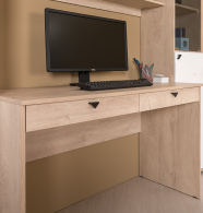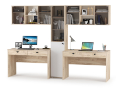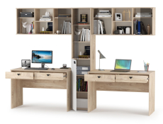 Домашний офис Бостон № 17 - универсальный комплект мебели составит основу пары комфортных рабочих зон для двух человек. Каждое рабочее место состоит из компьютерного стола и навесного шкафчика. Между рабочими зонами расположен высокий узкий шкаф-пенал со стеклом. Классический дизайн, элегантный цвет набора мебели позволит с успехом интегрировать его в обстановку современного кабинета. Все элементы мебели имеют универсальную сборку и могут быть расположены друг относительно друга в удобном Вам порядке. Компьютерный стол имеет вместительную столешницу, на которой достаточно места для ноутбука или монитора стационарного компьютера. Под столешницей на шариковых металлических направляющих закреплены два выдвижных ящика для документов и канцтоваров. Компактный навесной шкафчик увеличит комфорт и эргономичность Вашего рабочего места. Необходимые для работы и учебы материалы будут расположены на удобном, близком расстоянии. Конструктивно, шкаф представляет собой три ниши с одной полочкой каждая. Центральная ниша открытая, боковые закрыты дверками из тонированного стекла. Шкаф предполагает крепление к стене, комплект крепёжной фурнитуры входит в поставку. Максимальная нагрузка на каждую полку шкафа составляет 3 кг. Узкий, высокий шкаф-стеллаж увеличит комфорт и эргономичность Вашего рабочего места. Конструктивно, Верхняя дверка выполнена из тонированного стекла и имеет механизм открытия push (нажмите на уголок и дверка откроется). Двери шкафа универсальны и могут открываться в любую сторону, что нужно определить при первой сборке модуля. Домашний офис Бостон № 17 - элементы набора мебели для домашнего офиса Бостон.