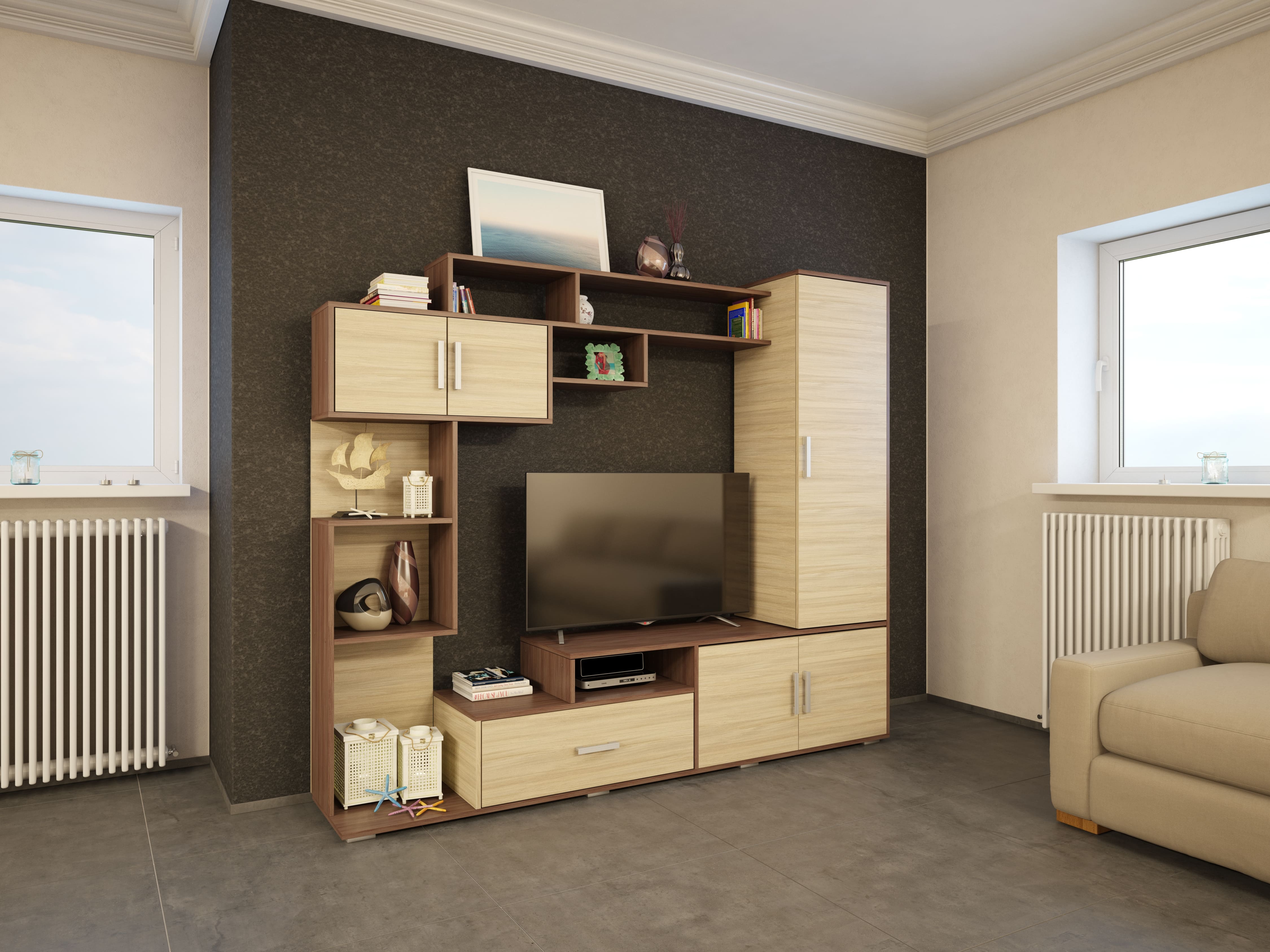 Многофункциональная гостиная ПЕКИН для общей комнаты. Благодаря контрастному сочетанию светлых и темных оттенков модель отлично впишется как современный, так и классический дизайн комнаты.