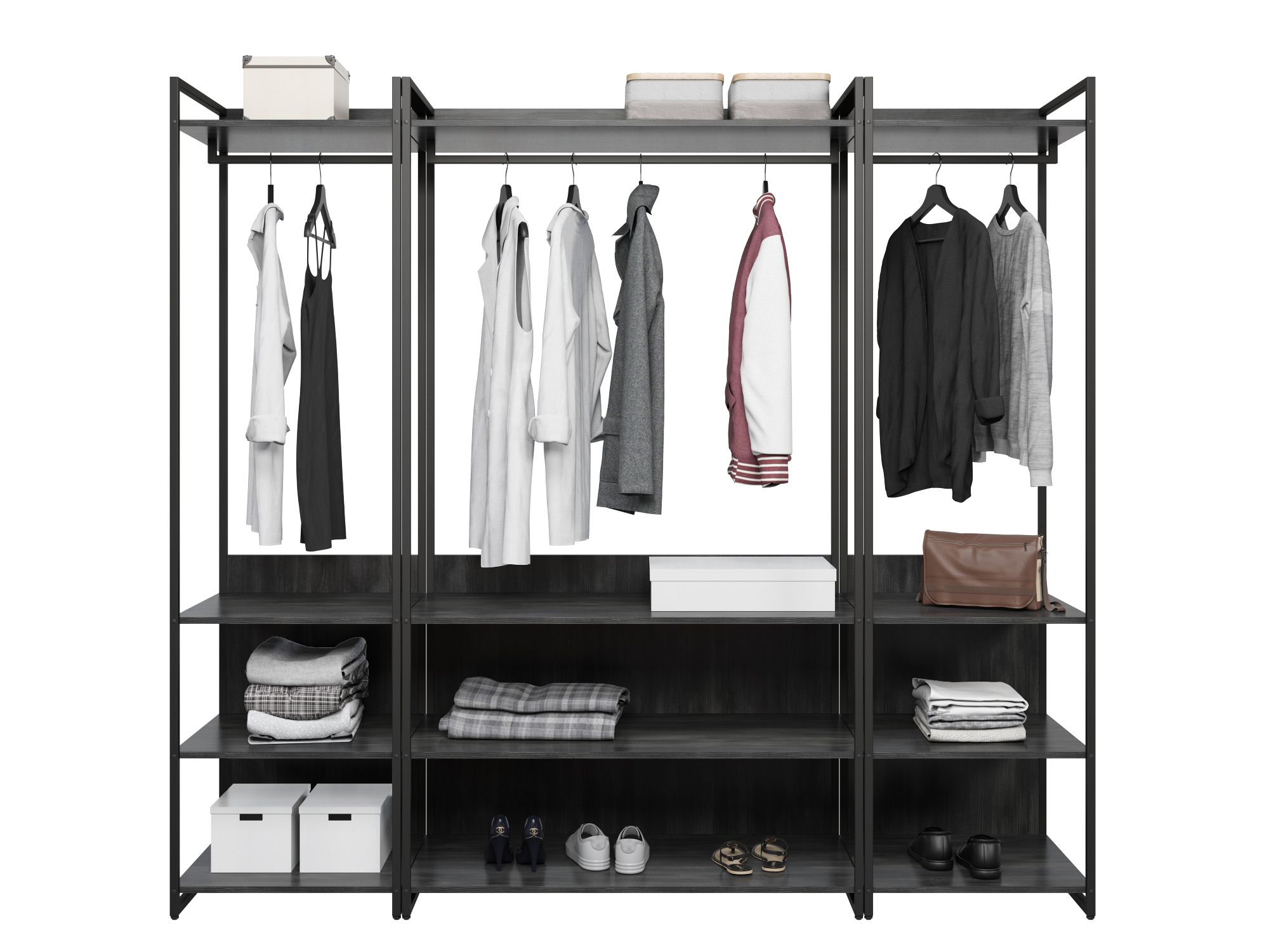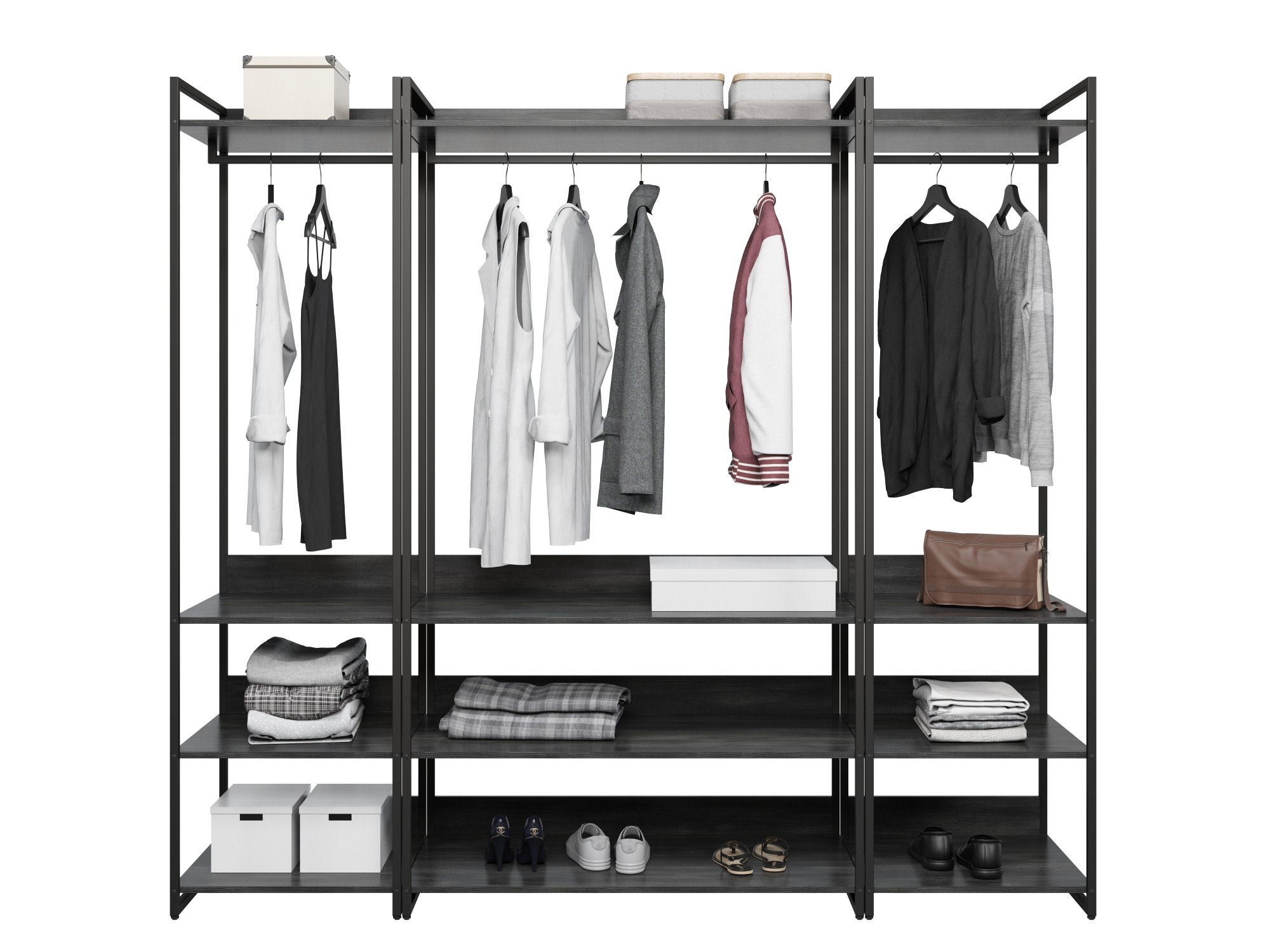 В комплект набора Urban 06 входят два узких стеллажа с штангами для вешалок и тремя полками снизу, а так же идентичный в два раза шире.