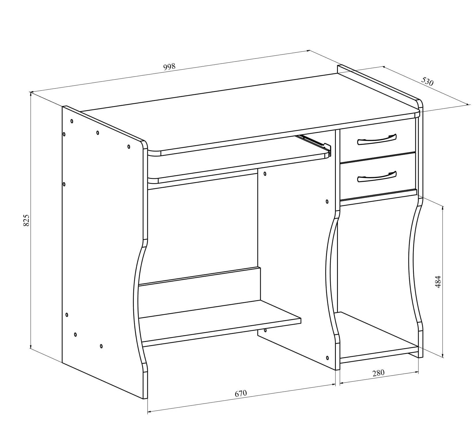 Свободная рабочая поверхность компьютерного стола С-203 предусматривает место для монитора, аудио колонок и негабаритных предметов для письма или компьютерных аксессуаров. Имеются два ящика на роликовых направляющих, выдвигающаяся полка для клавиатуры, место для системного блока и полка для папок внизу стола.