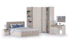 Спальный гарнитур Амели № 7 - благодатный уголок царства Морфея! Комфортно оформить самые личные покои дома поможет гарнитур спальный Амели № 7 - стильно, уютно, с профессиональным знанием вопроса. Художественные тонкости дизайна спального гарнитура Амели - имитация рисунка камня и глубокой геометрической фрезеровки. Жемчужина гарнитура спального Амели № 7 - красивая кровать с подъёмным ортопедическим основанием. Достойное дополнение кровати - миниатюрная тумбочка, туалетный столик с зеркалом и комодом, и шкафная группа из четырёх предметов. Маленькому столику туалетному Амели 12.48 с удобным выдвижным ящиком достаточно немного места, чтобы организовать уголок Красоты. Зеркало навесное Амели 03.240, большой размер, оптимальная форма и оригинальный дизайн - идеальная пара туалетному столику. Прямоугольная форма зеркала позволяет повесить его как горизонтально, так и вертикально, согласно Вашему дизайн-проекту. Компактный комод позволит аккуратно рассортировать бельё и одежду в четырёх удобных выдвижных ящиках. Кровать 1600 Амели 11.31 с подъёмным основанием и тумбочкой - традиция комфортного отдыха! Оптимальный размер спального места кровати, 1600х2000 мм., с подходом с трёх сторон - современная классика оформления места отдыха. Подъёмное ортопедическое основание в комплекте, матрас приобретается дополнительно. Углубление под матрас - 100 мм. Рекомендованная высота матраса от 180 до 200 мм. Максимально допустимая нагрузка на 1 спальное место - 100 кг. Наличие цоколя и короба с жёстким дном вместе с подъёмным ортопедическим основанием составляют вместительное хранилище для белья и постельных принадлежностей. Элегантный набор шкафов включает четыре максимально высоких шкафа - двустворчатый 13.133, угловой 13.13, стеллаж 13.133 и пенал 08.49. Двустворчатый распашной шкаф для одежды Амели 13.133 оборудован двумя полками и горизонтальной штангой для вешалок. Обе двери шкафа для одежды декорированы зеркалом, во всю длину двери, что позволит Вам выбрать наряд прямо «на одном месте»! Угловой шкаф Амели 13.131 - связующий модуль этой эргономичной мебельной группы и существенное дополнение системы хранения. Одностворчатый угловой шкаф Амели 13.131, за распашной дверью, оборудован пятью полками и штангой для одежды на вешалках. Компактный, одностворчатый распашной пенал-шкаф Амели 08.49 с пятью полками - идеальная форма хранения белья и личных вещей. Стеллаж Амели 13.140 - оригинальное окончание мебельной стеночки, компактное, изящное, с лёгким доступом к предметам. Открытый стеллаж с четырьмя полочками - лучший способ сделать гарнитур визуально более лёгким и живописным за счёт изысканного декора. Фрезеровка на фасадах мебели, зеркалах и декоративная прострочка мягких элементов кровати выполнены в виде полосок и зигзагов.