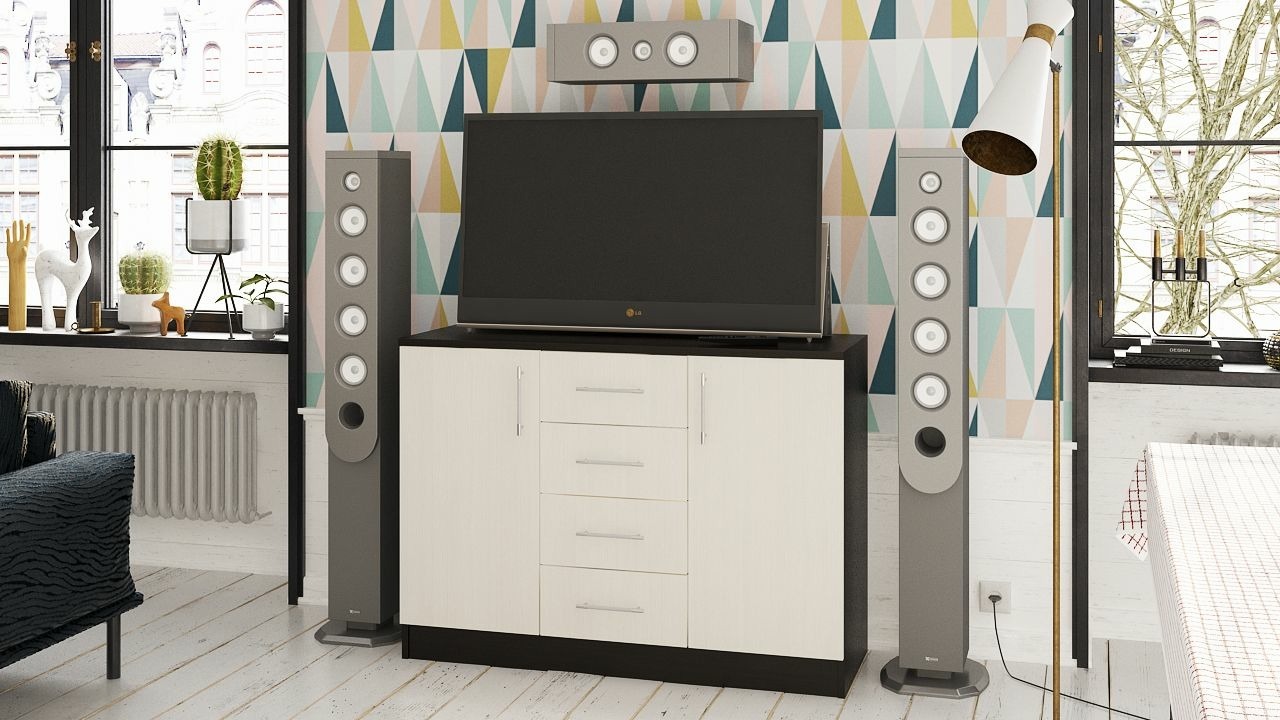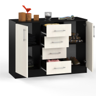 В данной модели объединены модное сочетание контрастных цветов, удобная конструкция, вместительность и приятная цена. Комод имеет три равной ширины части и симметричную сборку. Центральная часть - это четыре выдвижных ящика. По бокам расположены закрытые распашными дверками ниши с одной полочкой в каждой. Стильные ручки реллинги, выполненные в сочетании цвета хромированного и матового металла, украшают фасады комода. Универсальность комода заключается в его предназначении, которое выбираете исключительно Вы. Комод пригодится в квартире, дома и в офисе, на даче, в учебном или государственном учреждении. Ящики закреплены на металлических роликовых направляющих, обеспечивающих прямой, лёгкий ход. Корпус и фасады выполнены из ламинированной ДСП 16 мм., края закромлены плёнкой ПВХ. Поставляется в разобранном виде, надёжно упакованным, в комплекте с фурнитурой и инструкцей по сборке.