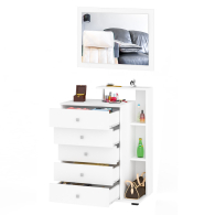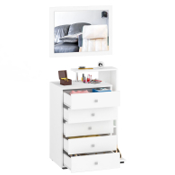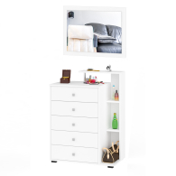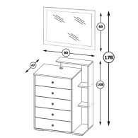 Классическая форма комода с пятью выдвижными ящиками креативно дополнена узкой открытой нишей с тремя полками и верхней полочкой. Большое, нарядное зеркало повысит уровень комфорта в спальне, оживит интерьер магией блеска и света. Зеркало можно располагать как горизонтально, так и вертикально. Мебель выполнена из экологически чистой ЛДСП. Детали обработаны кромкой ПВХ. В производстве использована фурнитура высоких стандартов, ящики модулей установлены на роликовые направляющие. Поставляется в разобранном виде в надёжной упаковке, с комплектом сборочной фурнитуры и инструкцией по сборке.