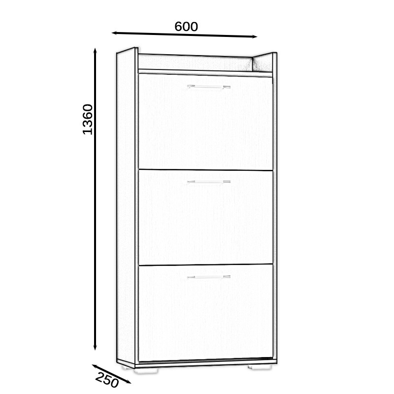 Данная модель представляет собой узкую, высокую тумбу с тремя закрытыми откидными дверками отделениями. Дверки обувницы оборудованы полочками, что увеличивает вместительность тумбы вдвое. Верхний горизонт тумбы ограничен с трёх сторон, и это позволяет использовать его, как открытую полочку. Глубина тумбы составляет 25 см., это даёт возможность меблировать даже самые небольшие прихожие. Корпус и фасады выполнены из ЛДСП 16 мм., края закромлены плёнкой ПВХ. Поставляется в разобранном виде, надёжно упакованным, в комплекте с фурнитурой и инструкцией по сборке.