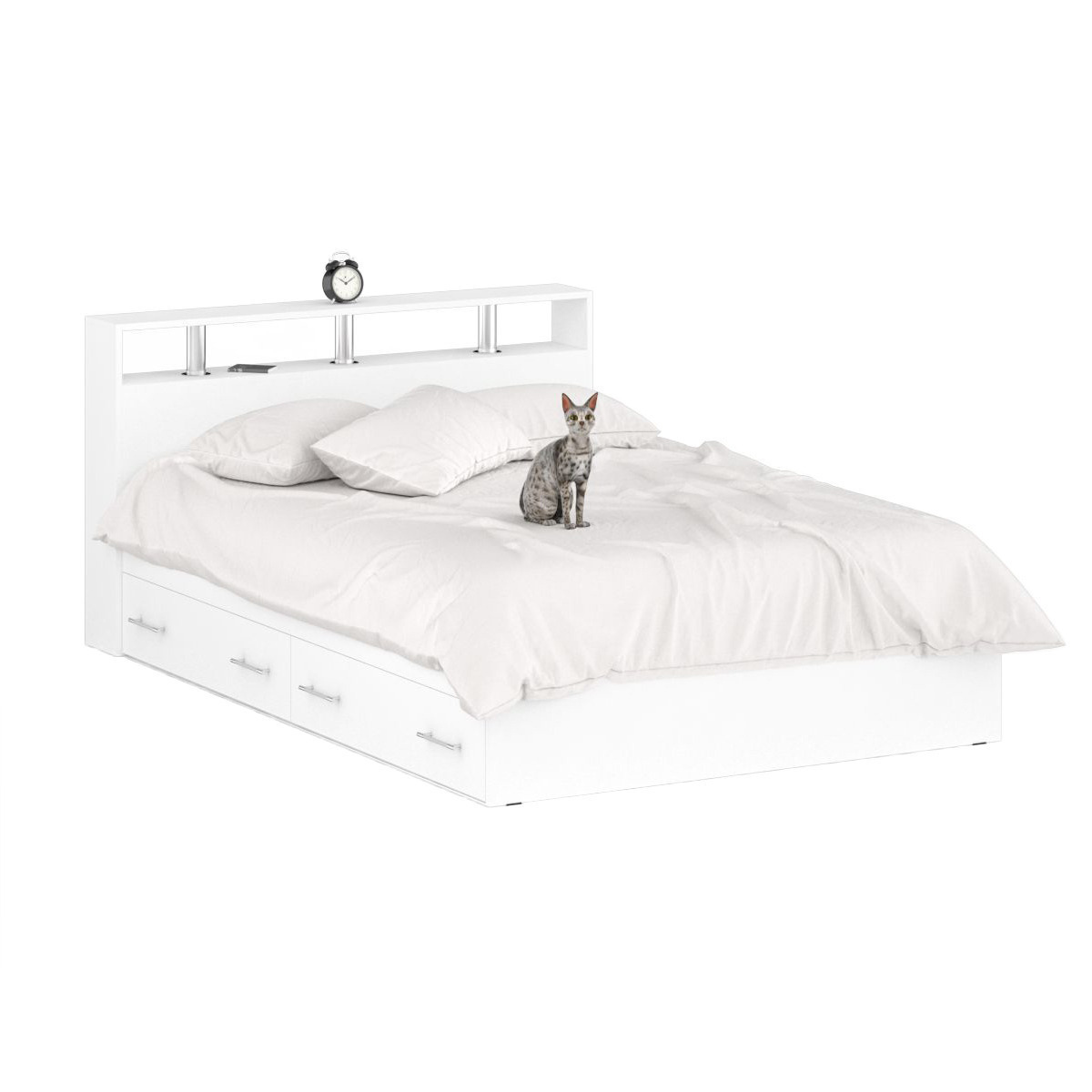 Компактная двуспальная кровать с трёхсторонним доступом к спальному месту размером 1400х2000 мм и изголовьем с хромированными стойками. В основании кровати расположены два вместительных ящика для хранения постельных принадлежностей и личных вещей. Предусмотрена универсальная схема сборки бельевых ящиков - они могут быть установлены с правой или с левой стороны кровати. Основание под матрас в комплекте (настил ДСП) кровати, матрас приобретается отдельно. Фурнитура высоких стандартов. Ящики закреплены на металлических роликовых направляющих, обеспечивающих прямой, лёгкий ход. Корпус и фасады выполнены из ЛДСП, края закромлены плёнкой ПВХ, хромированная труба 25 мм. Поставляется в разобранном виде, надёжно упакованным, в комплекте с фурнитурой и инструкцией по сборке. Элемент из набора мебели для спальни Камелия.